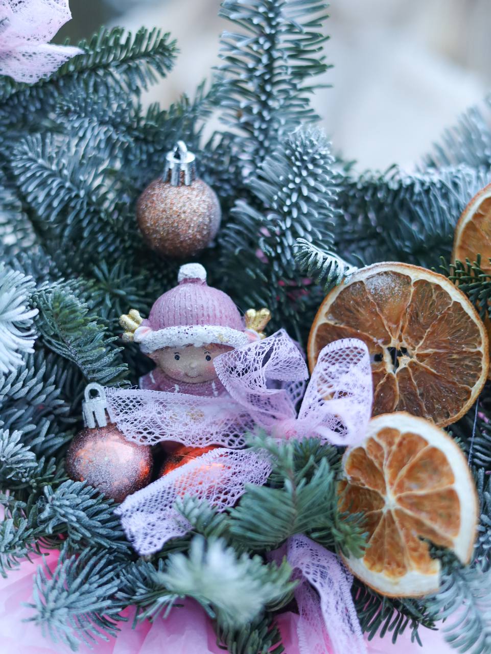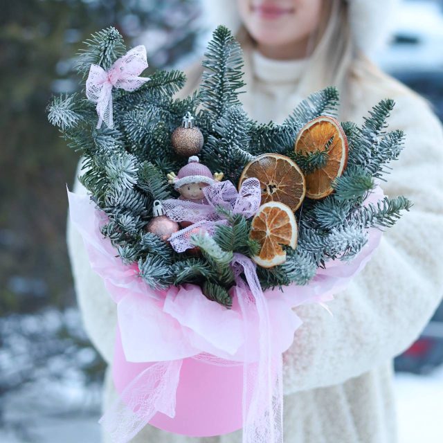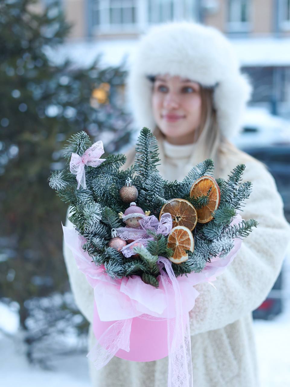 Композиция нобилиса, декоративных игрушек и апельсинов в шляпной коробке.