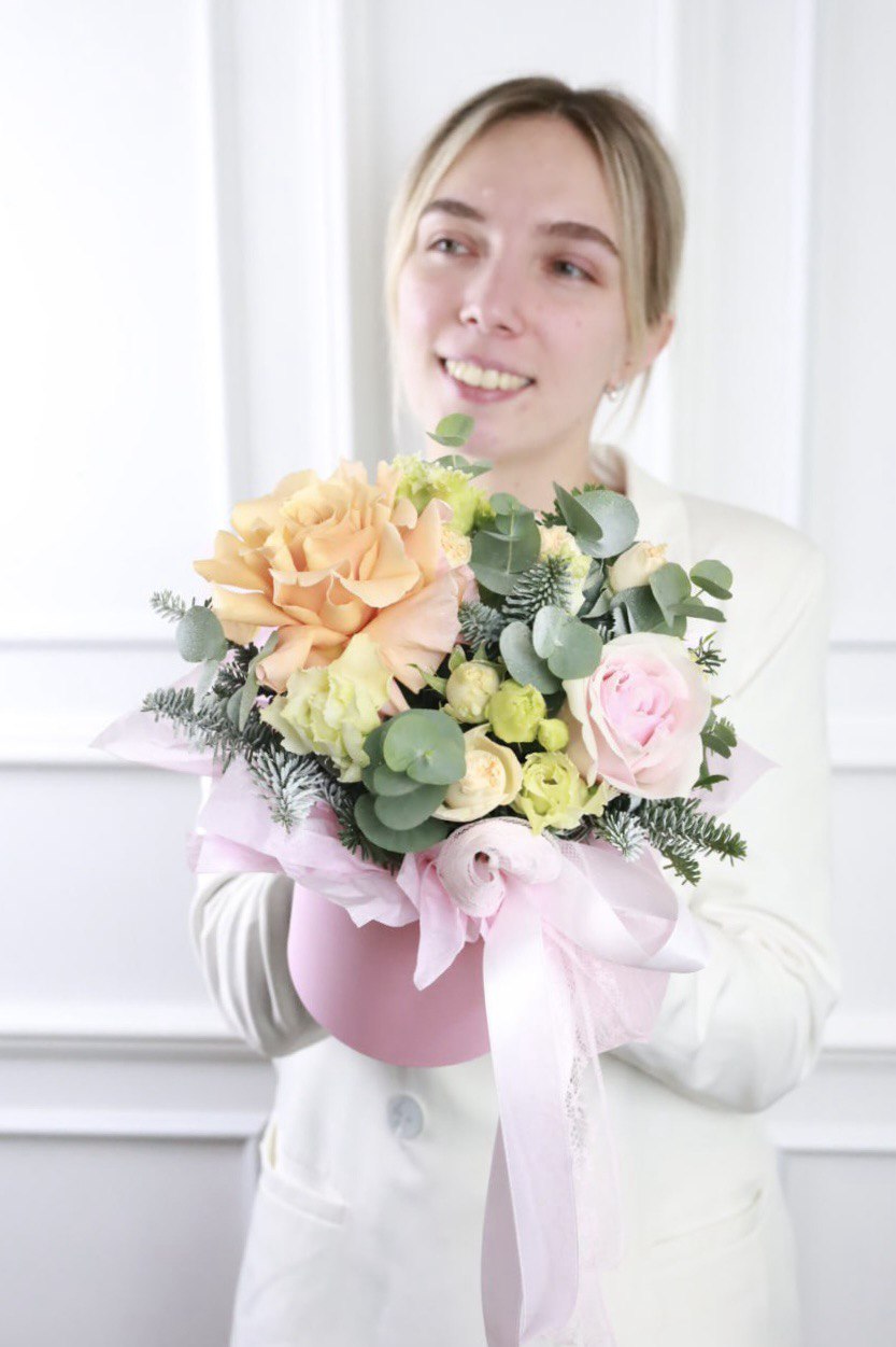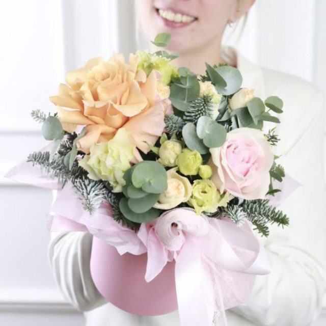 Очаровательная композиция в бело-розово-кремовой гамме в шляпной коробке.