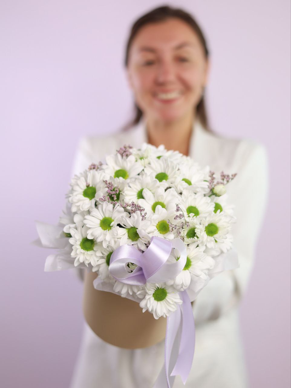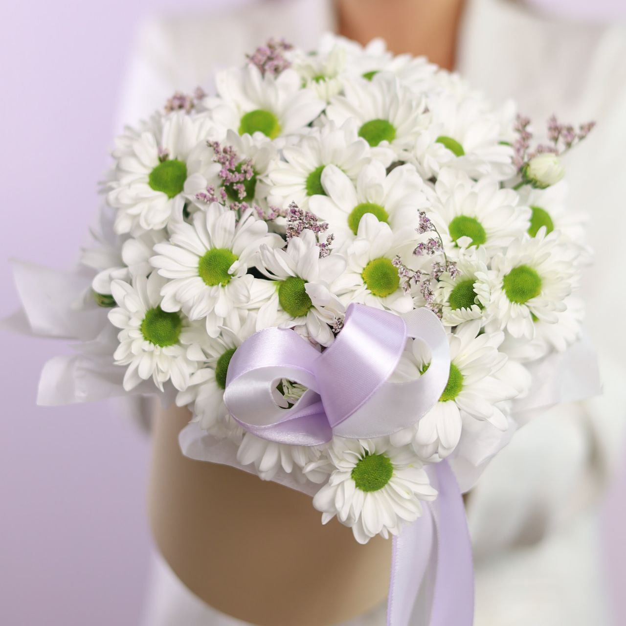 Композиция с хризантемой и лимониумом в шляпной коробке.