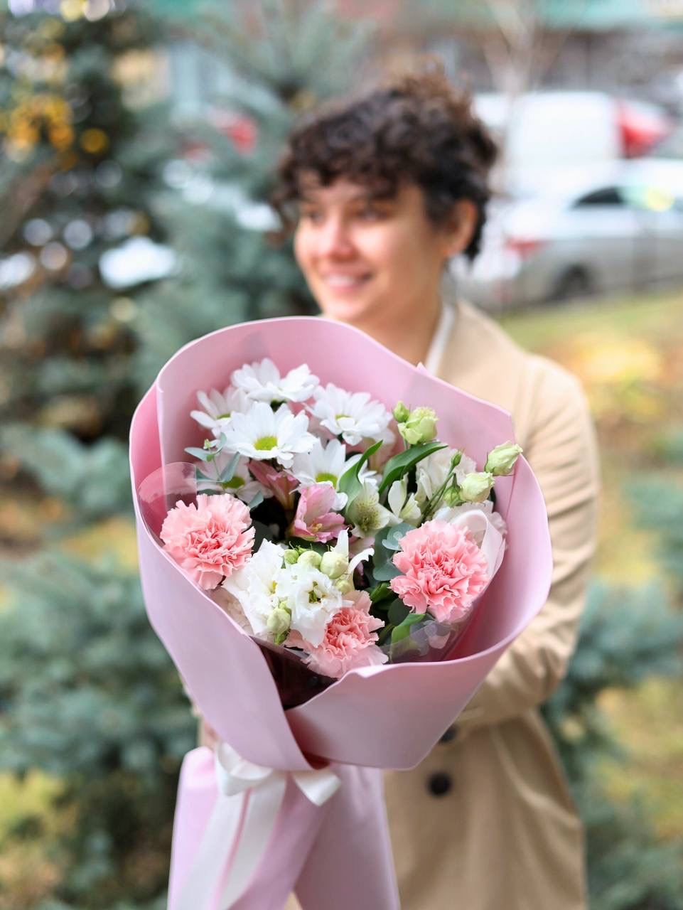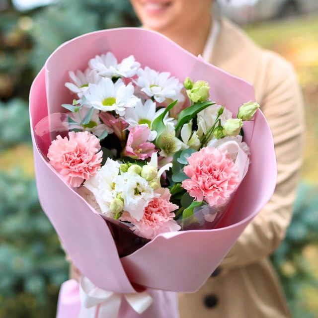 Очаровательный аккуратный букет с нежной эустомой, стойкими диантусами, хризантемой, альстромерией и эвкалиптом.