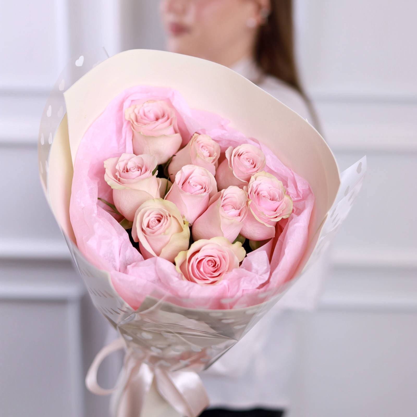 Очаровательный букет из 9 роз с крупным бутоном в оформлении.