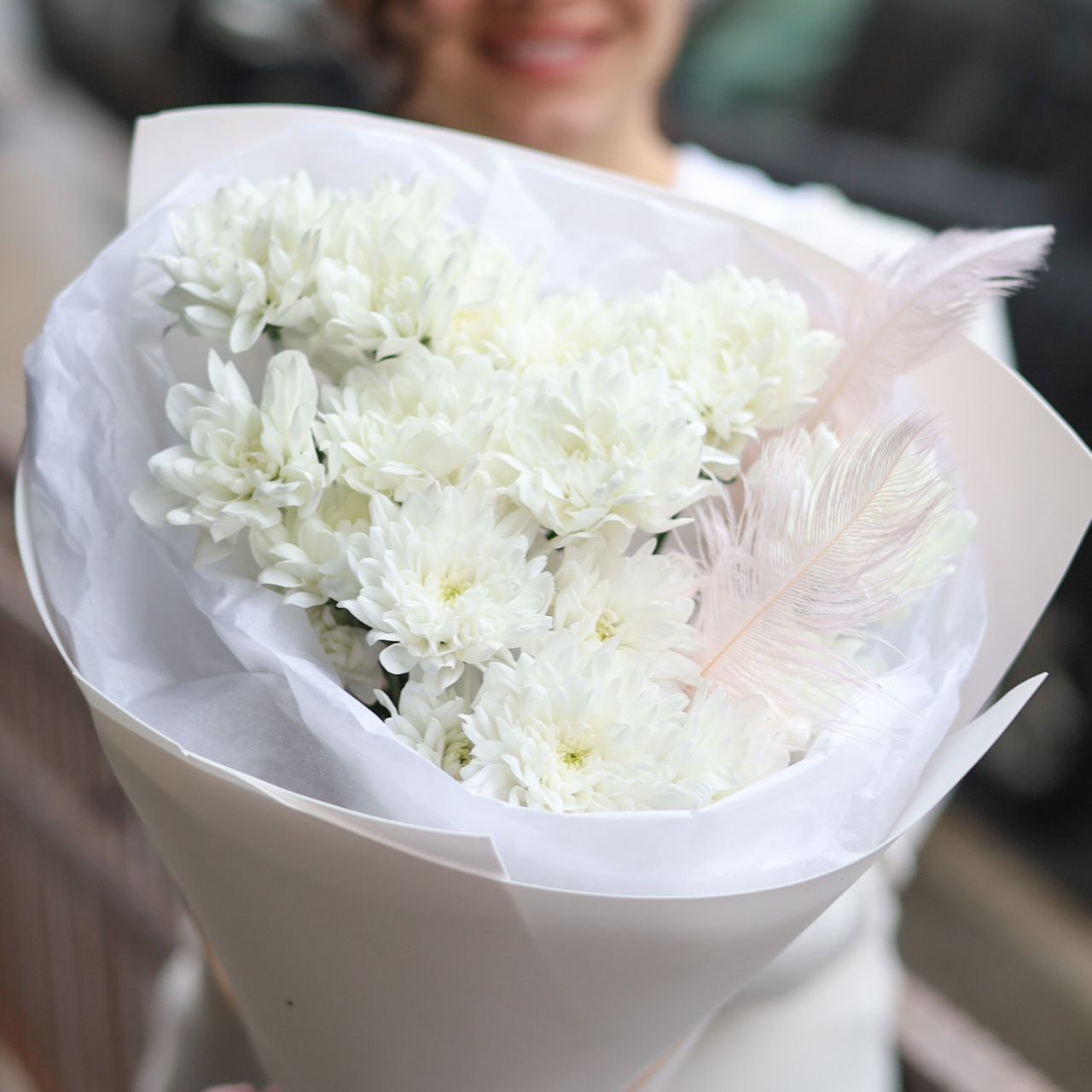 Букет хризантемы и перьев в оформлении.