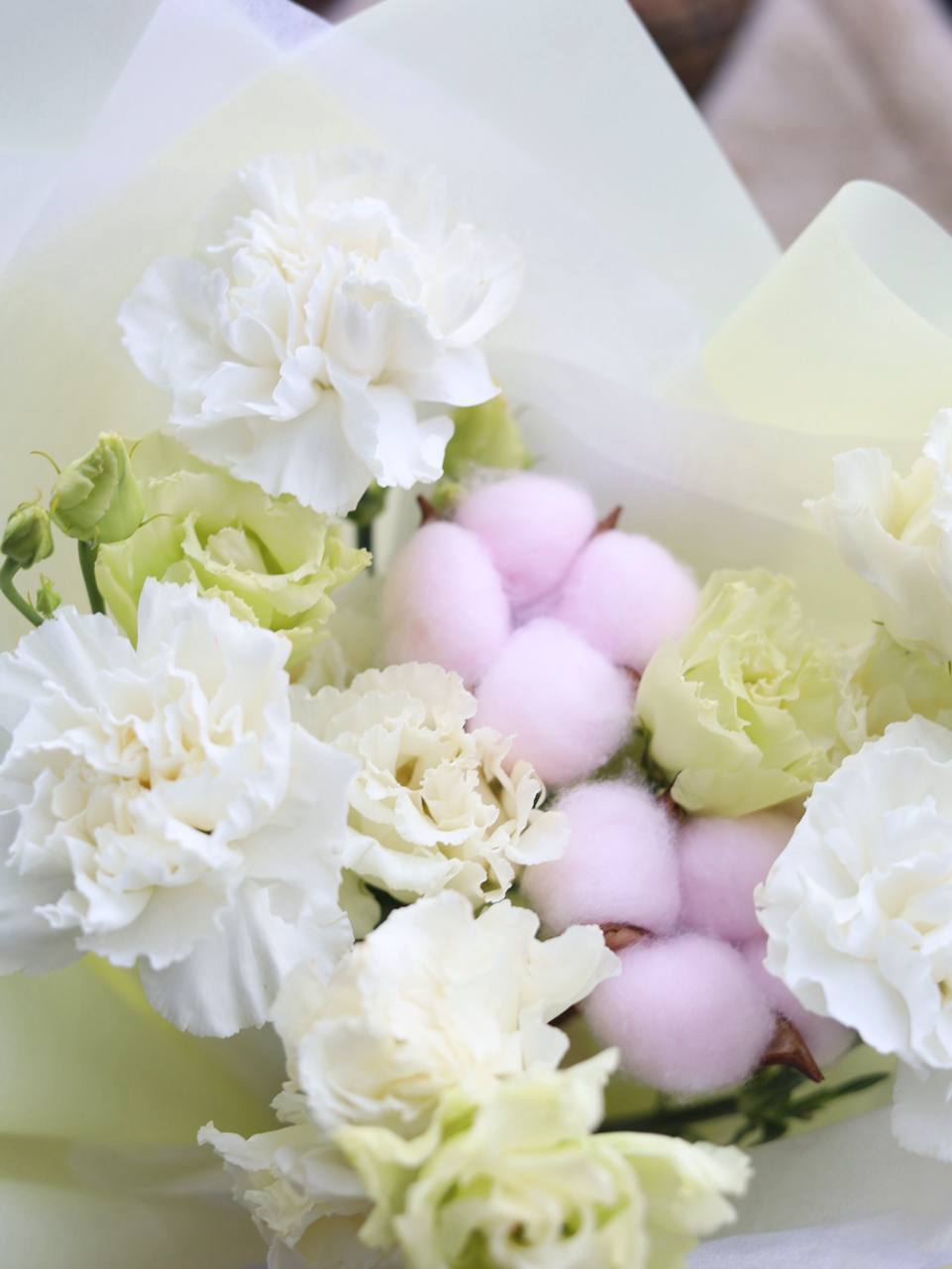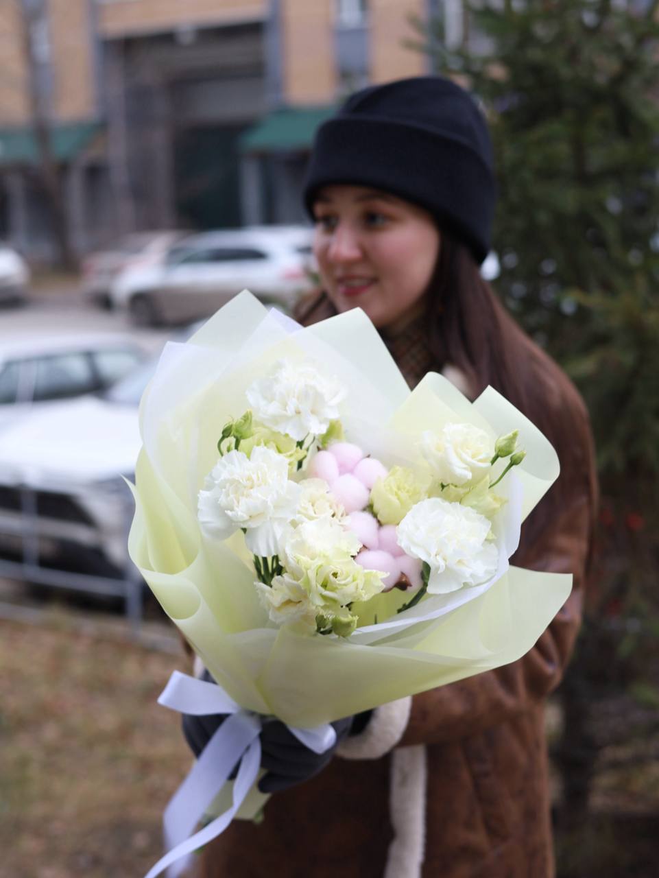 Милый букет с ажурной эустомой, диантусами и хлопком