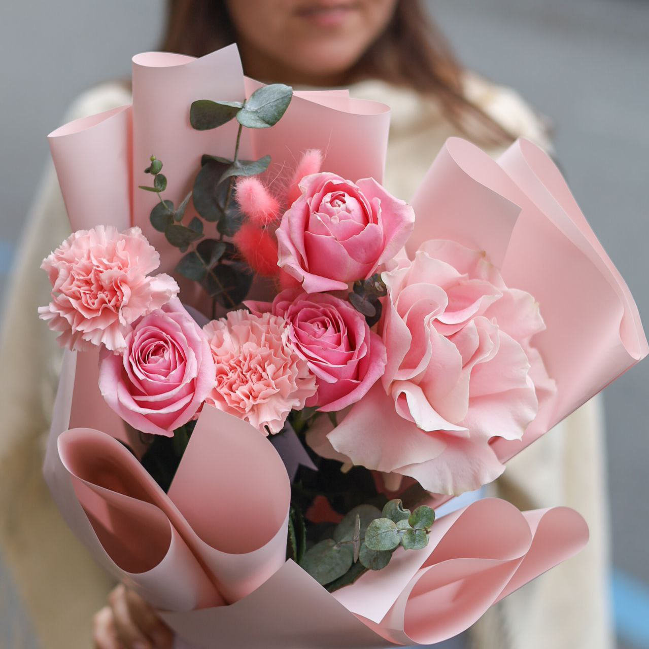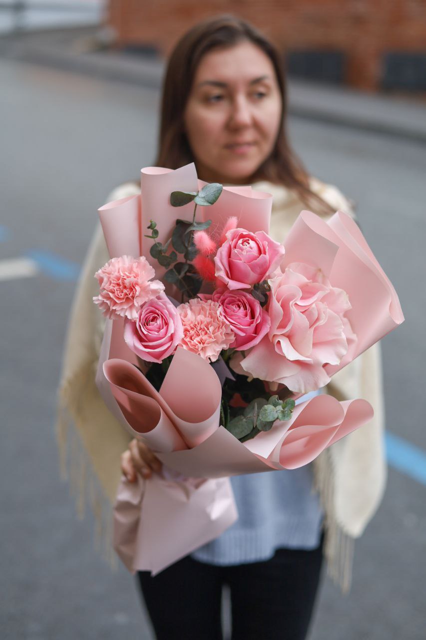 Милый букет в нежной гамме с французской розой, стойким диантусом, розой и эвкалиптом в оформлении.