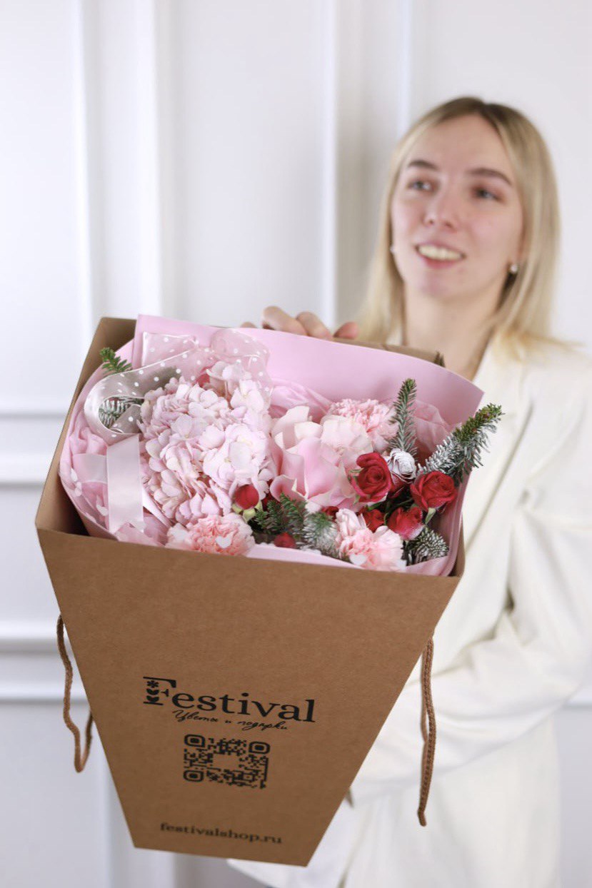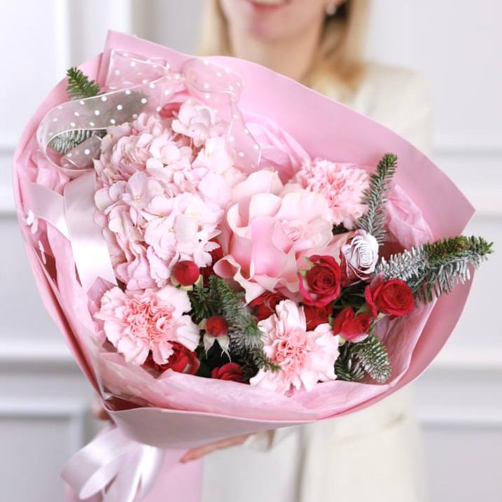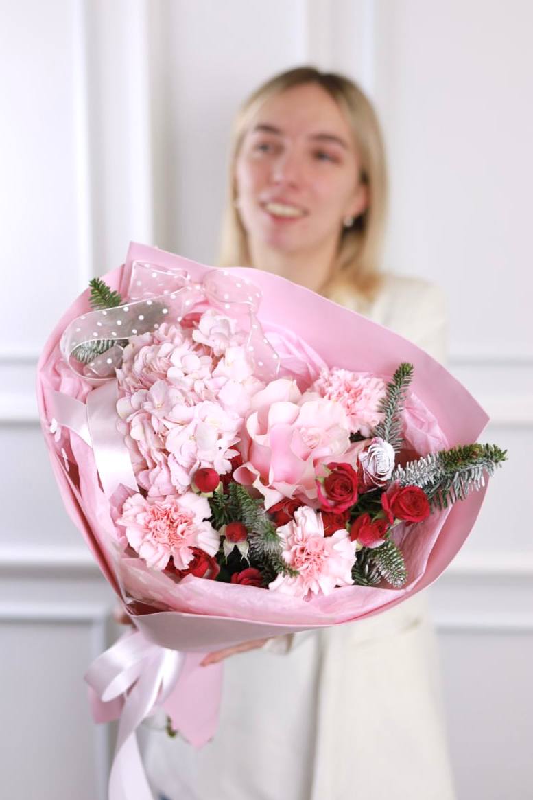 В составе букета: гортензия, кустовые розы, французская роза, диантусы и нобилис