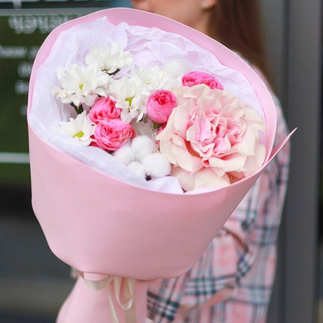 Состав: кустовые пионовидные розы, стойкая хризантема и хлопок, французская роза.