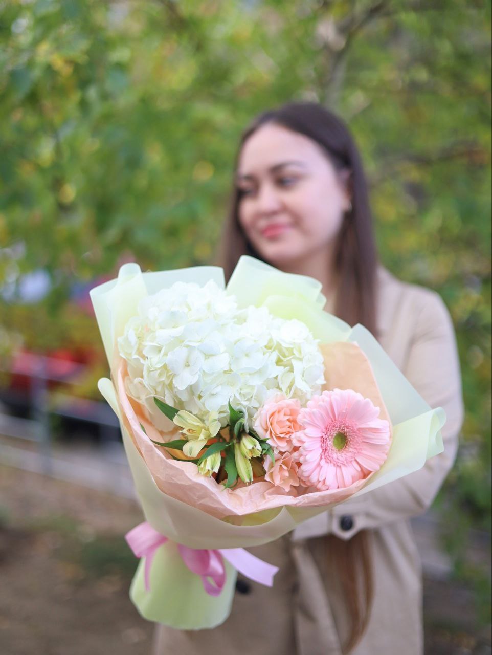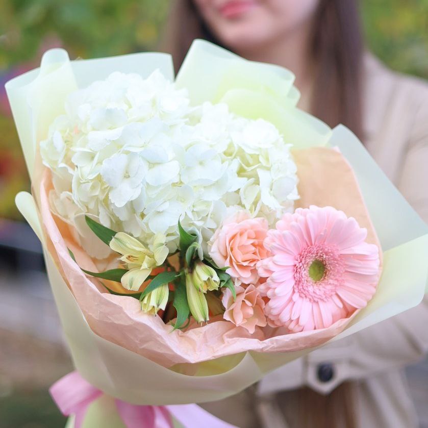 Букет с пышной гортензией, герберой и альстромерией в оформлении.