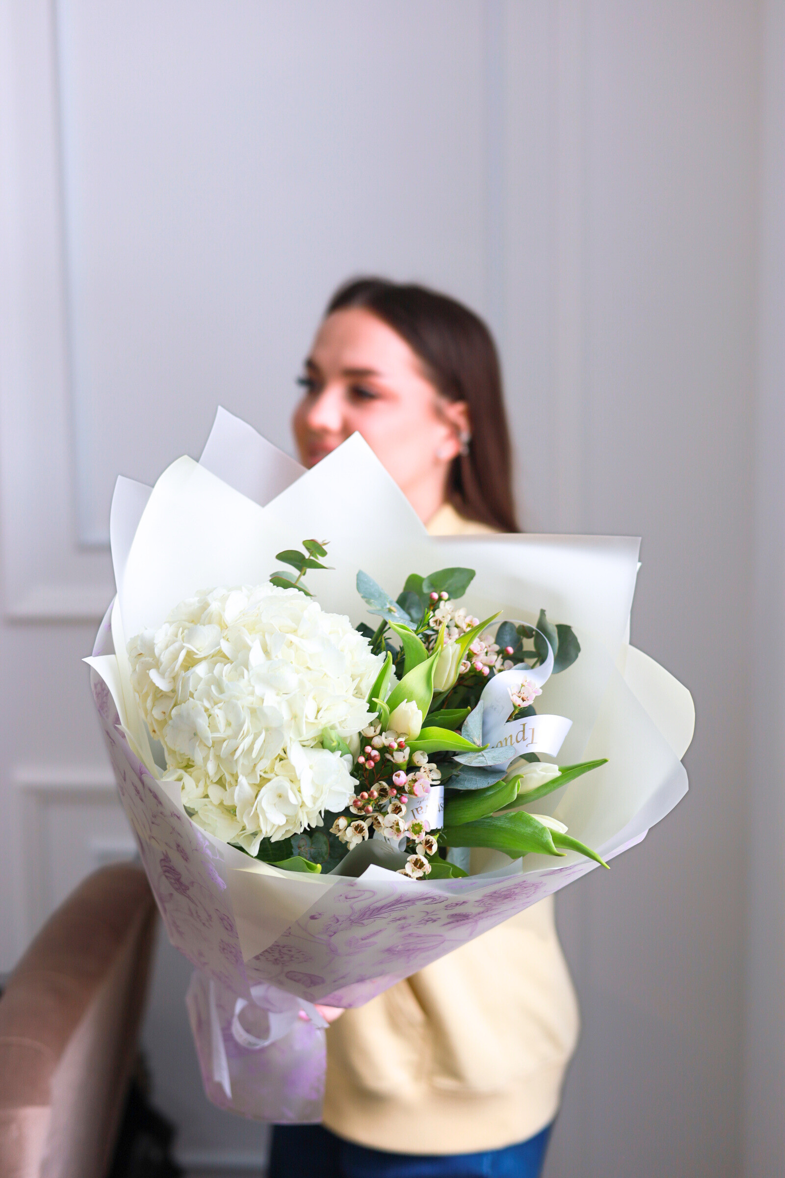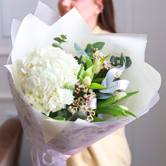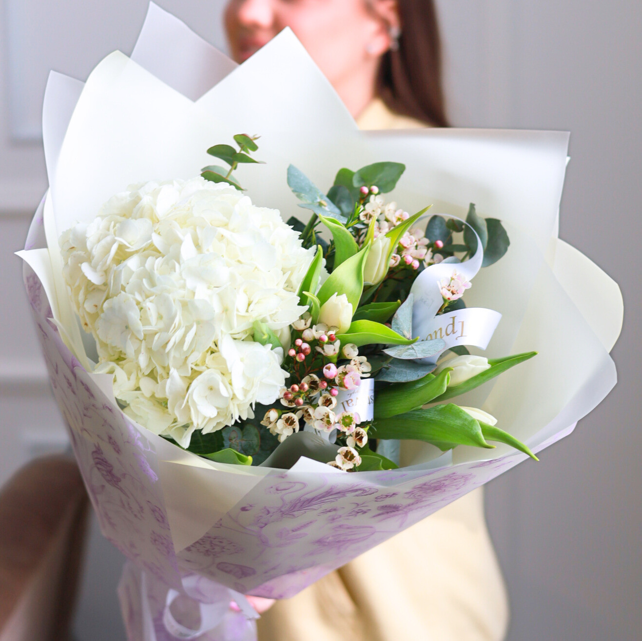 Красивый букет с тюльпанами, гортензией, хамелациумом и эвкалиптом.