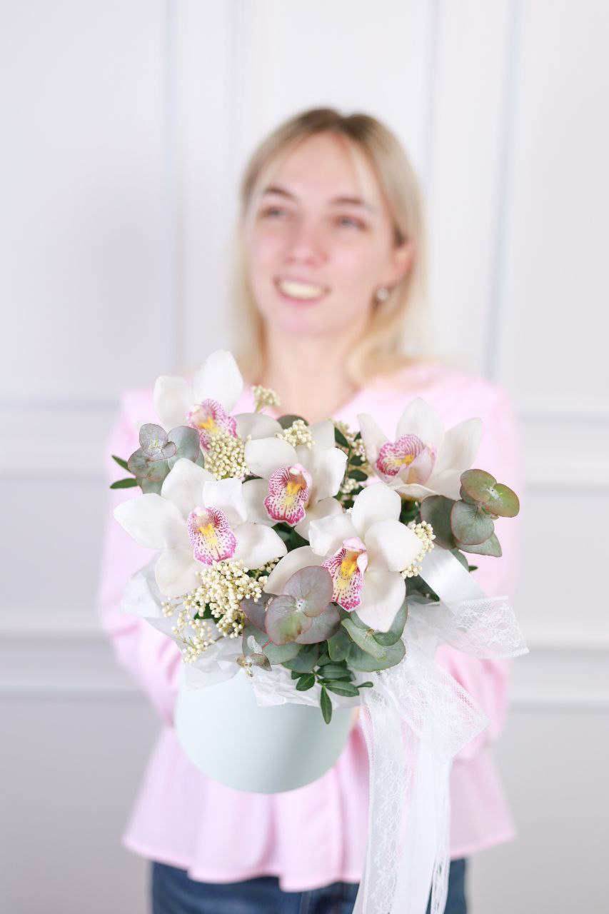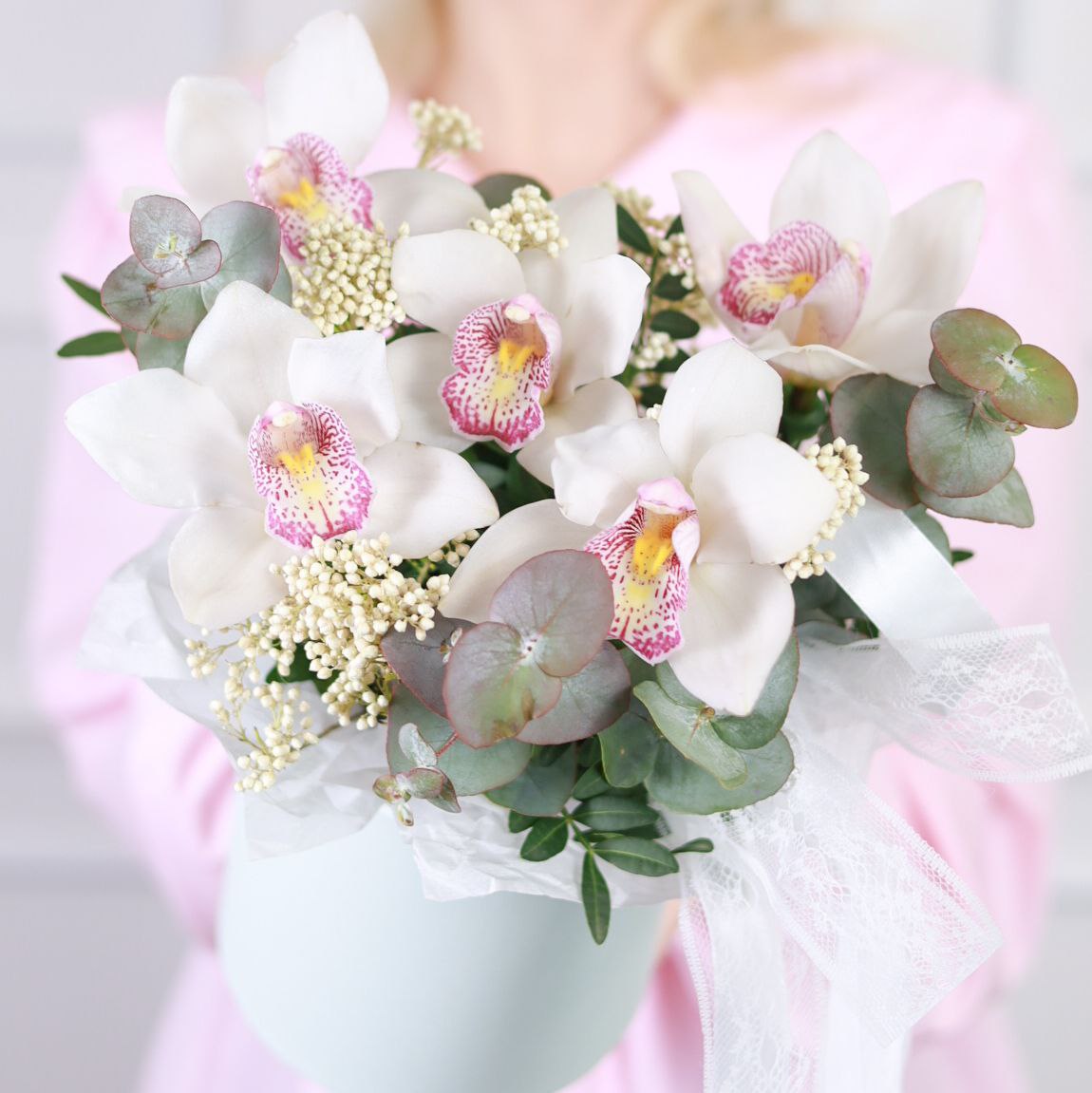 Композиция в шляпной коробке с орхидеями, озотамнусом, эвкалиптом.