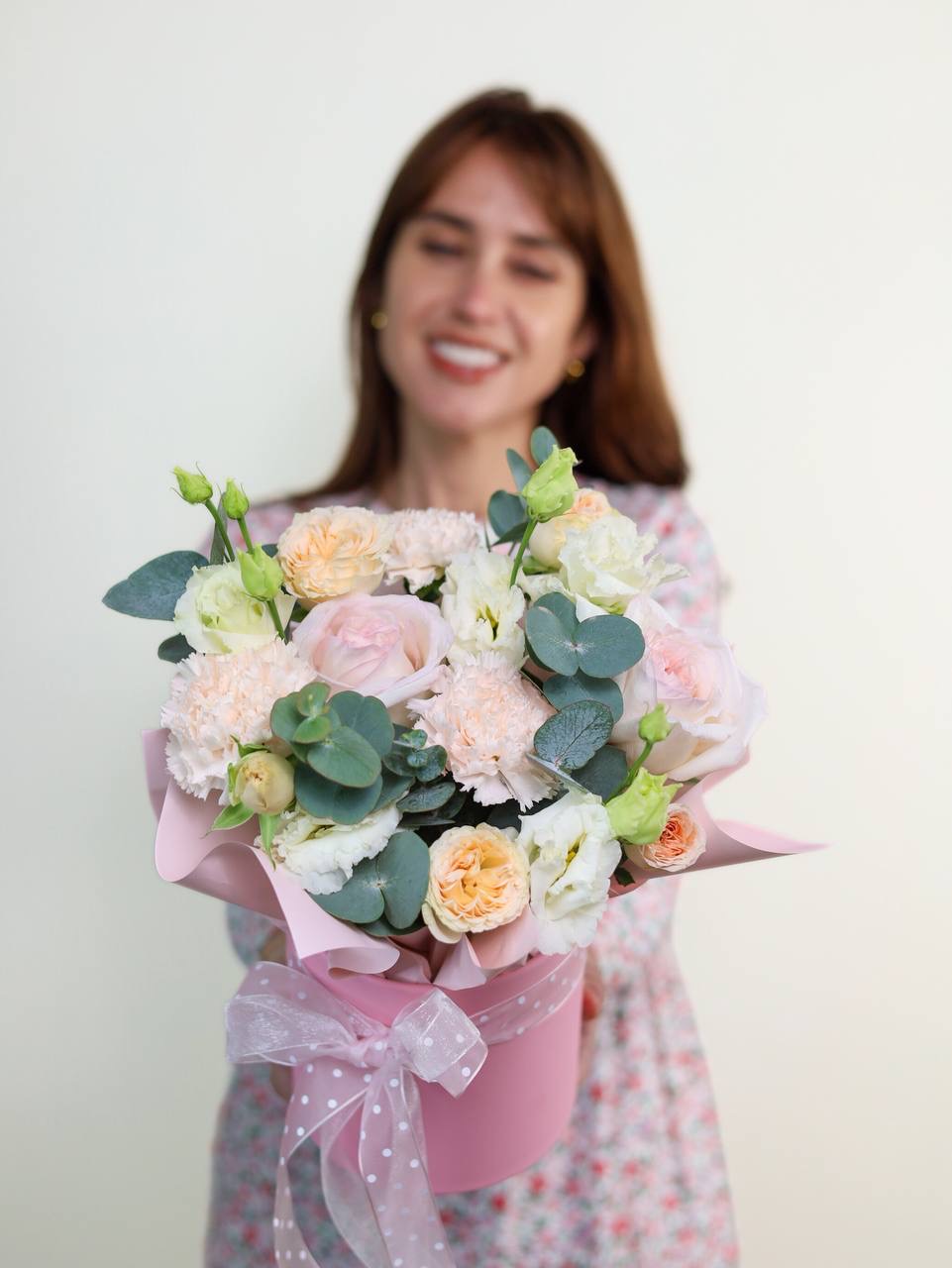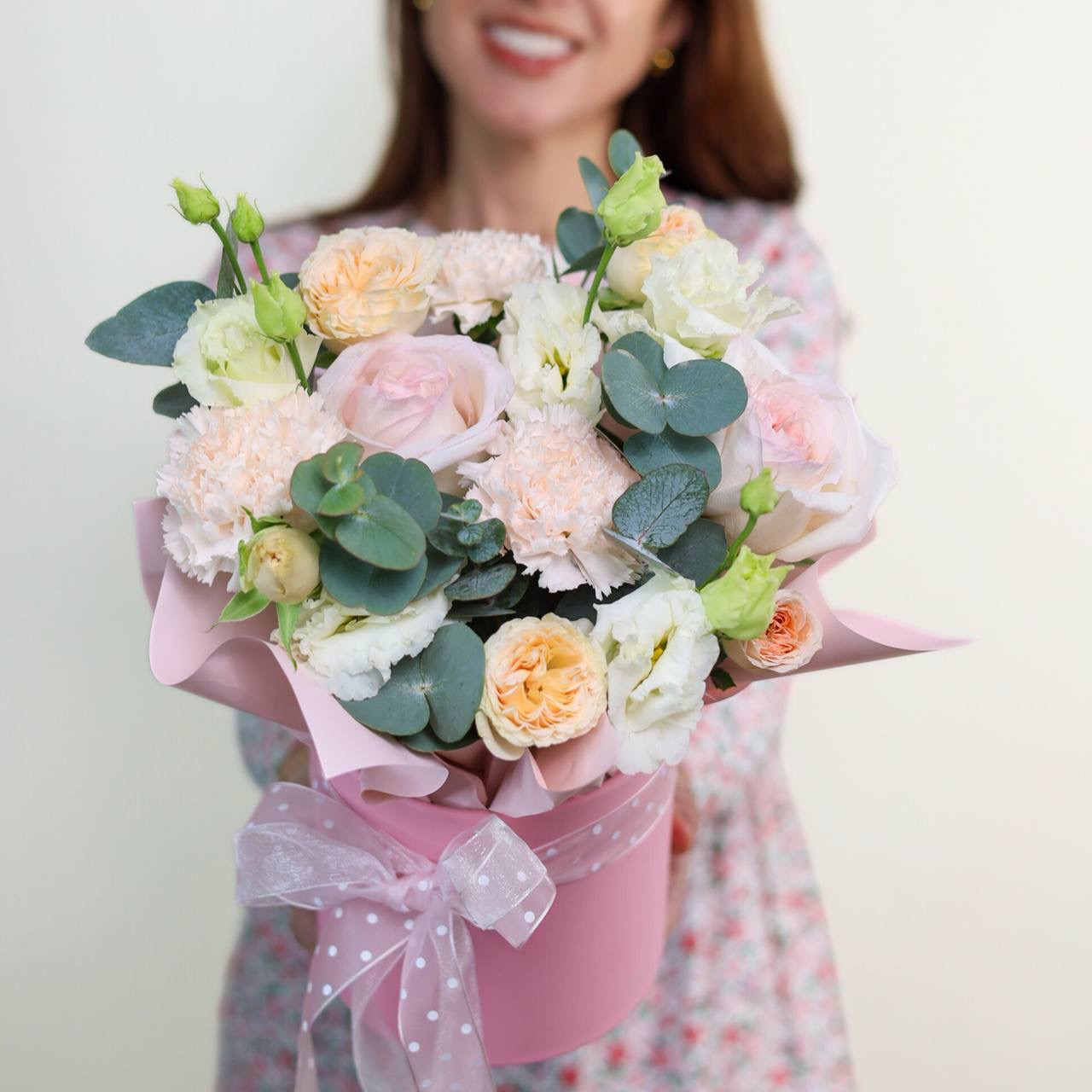Прекрасная сборная композиция в нежной гамме в шляпной коробке.