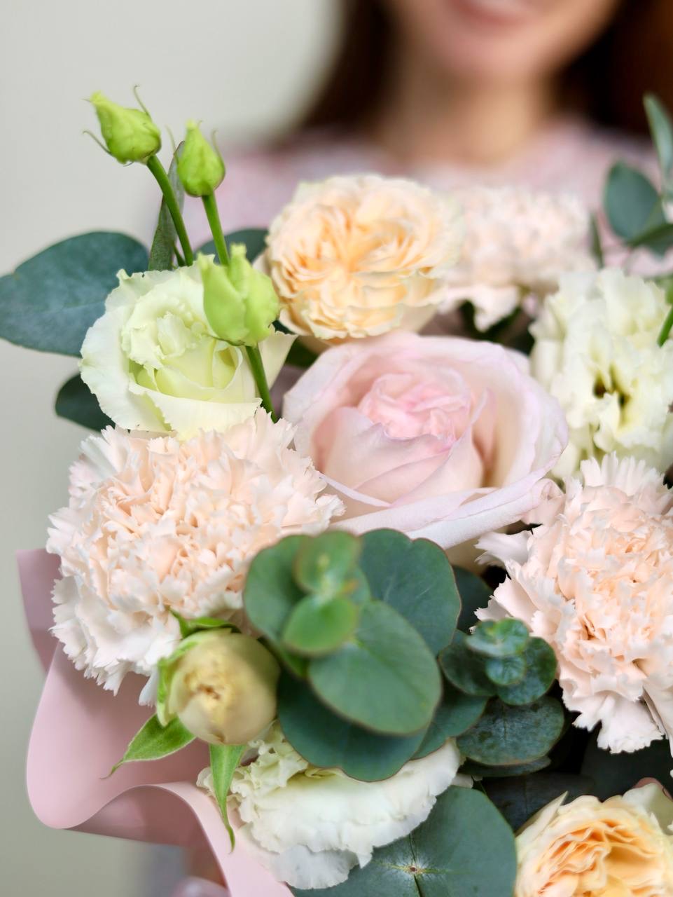 Состав: кустовые и одноголовые розы, стойкие диантусы, эустома, эвкалипт.