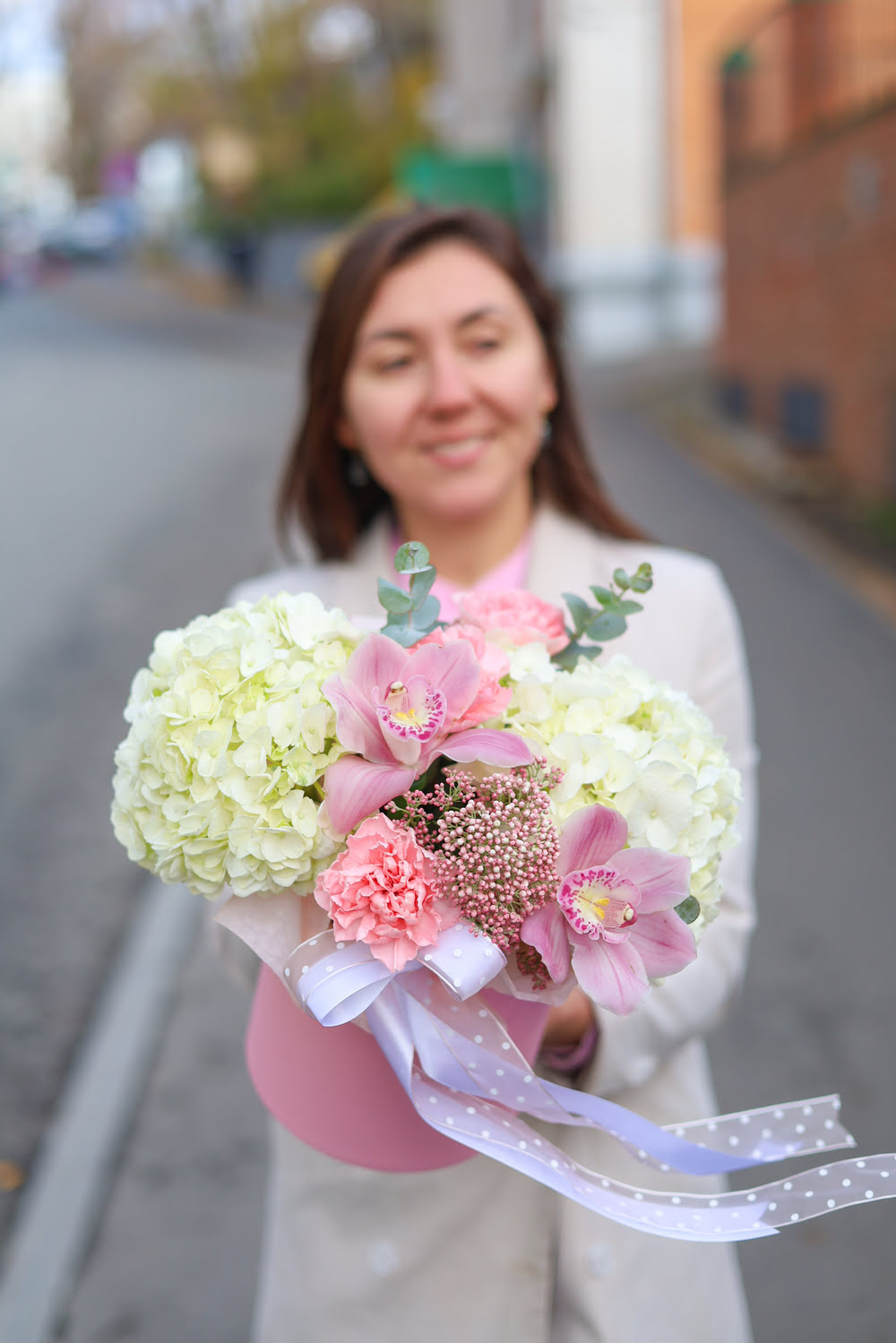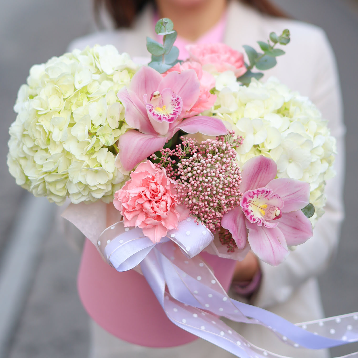 Состав: пышные гортензии, стойкие диантусы и орхидеи, озотамнус, душистый эвкалипт.