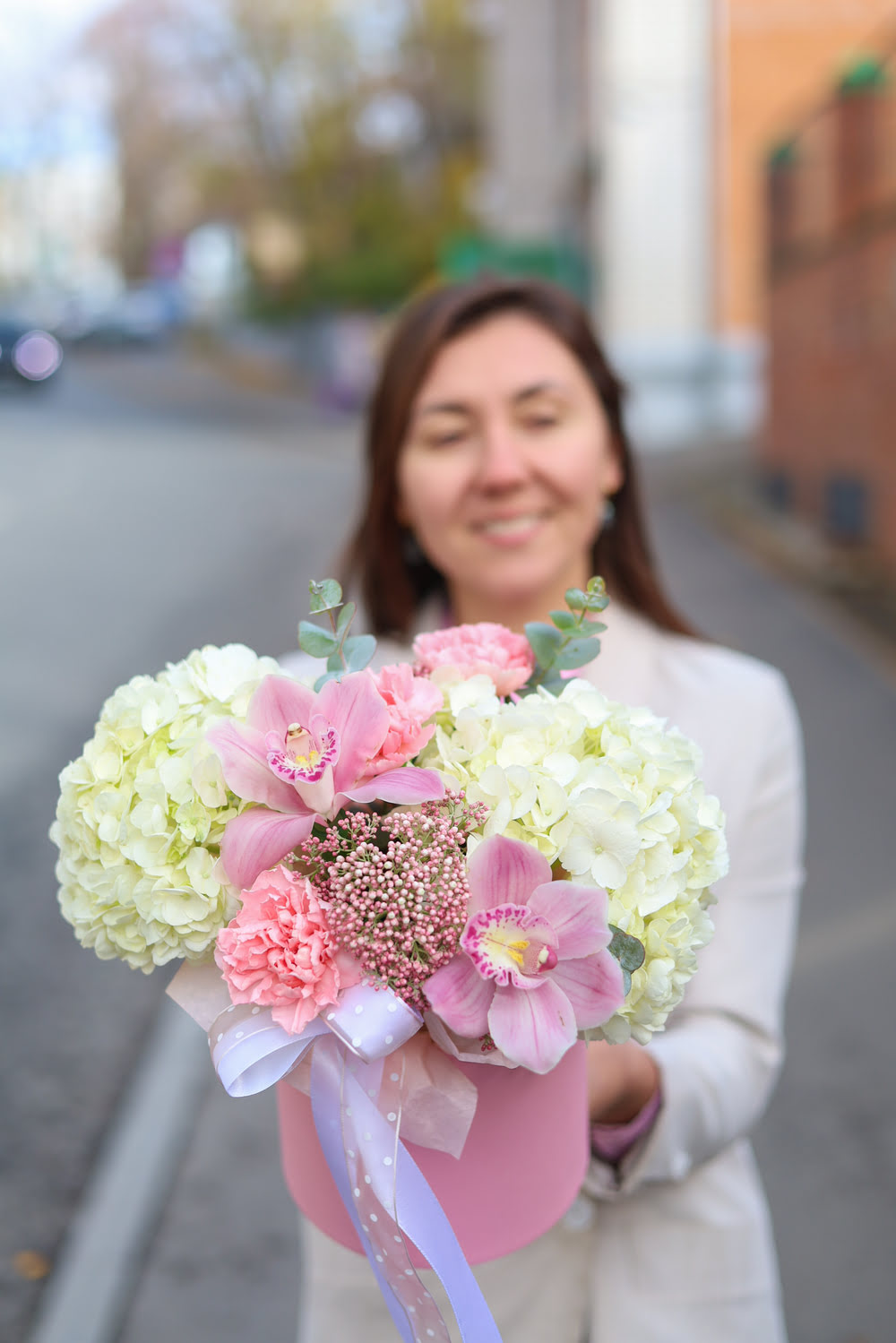 Прекрасная композиция в бело-розовой гамме в шляпной коробке.