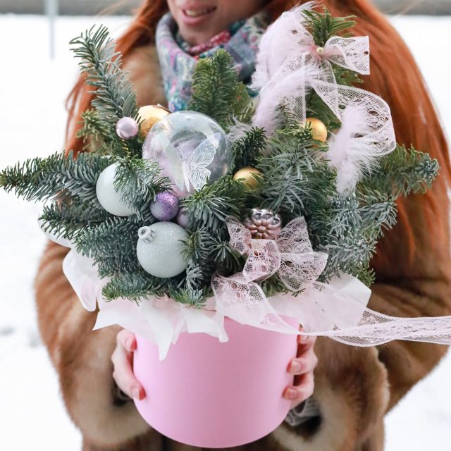 Чарующая новогодняя композиция в нежно-розовой гамме в шляпной коробке.