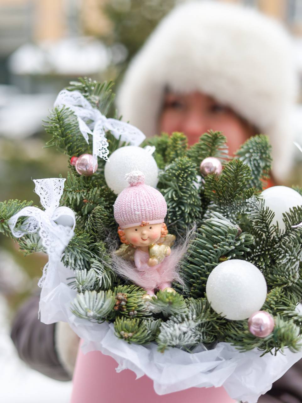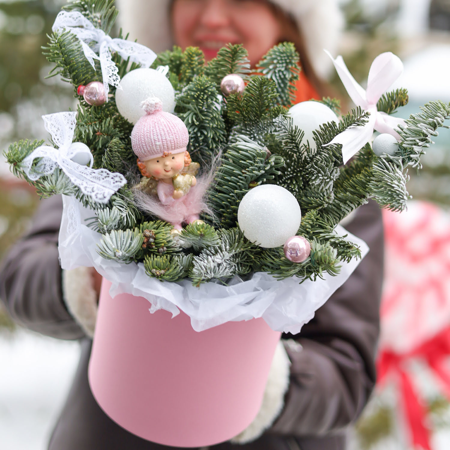 Стильная новогодняя композиция с декором в нежной гамме с декоративной интерьерной игрушкой.