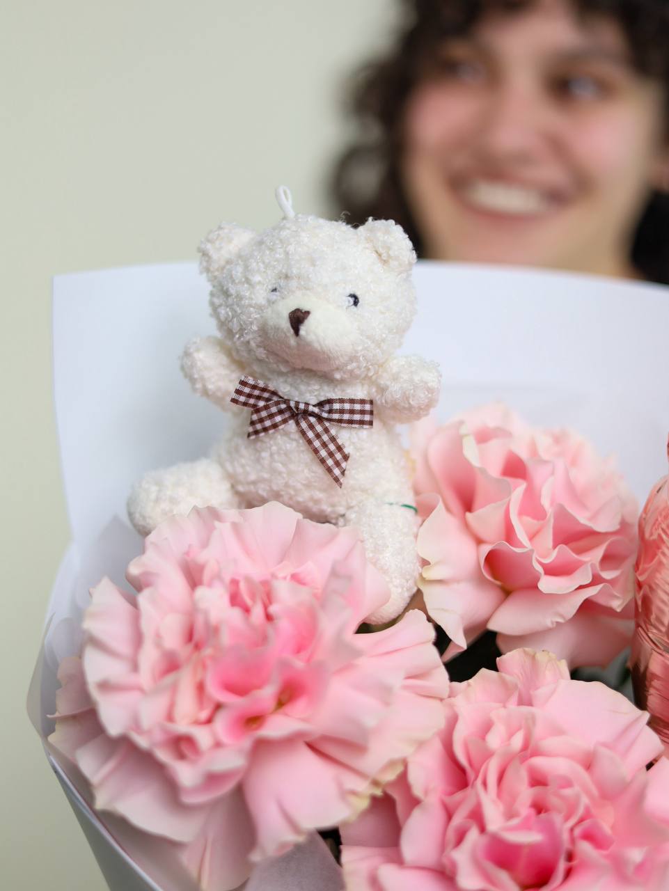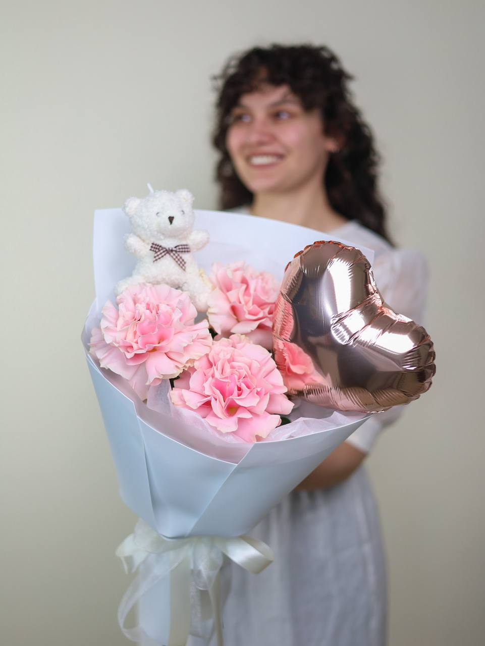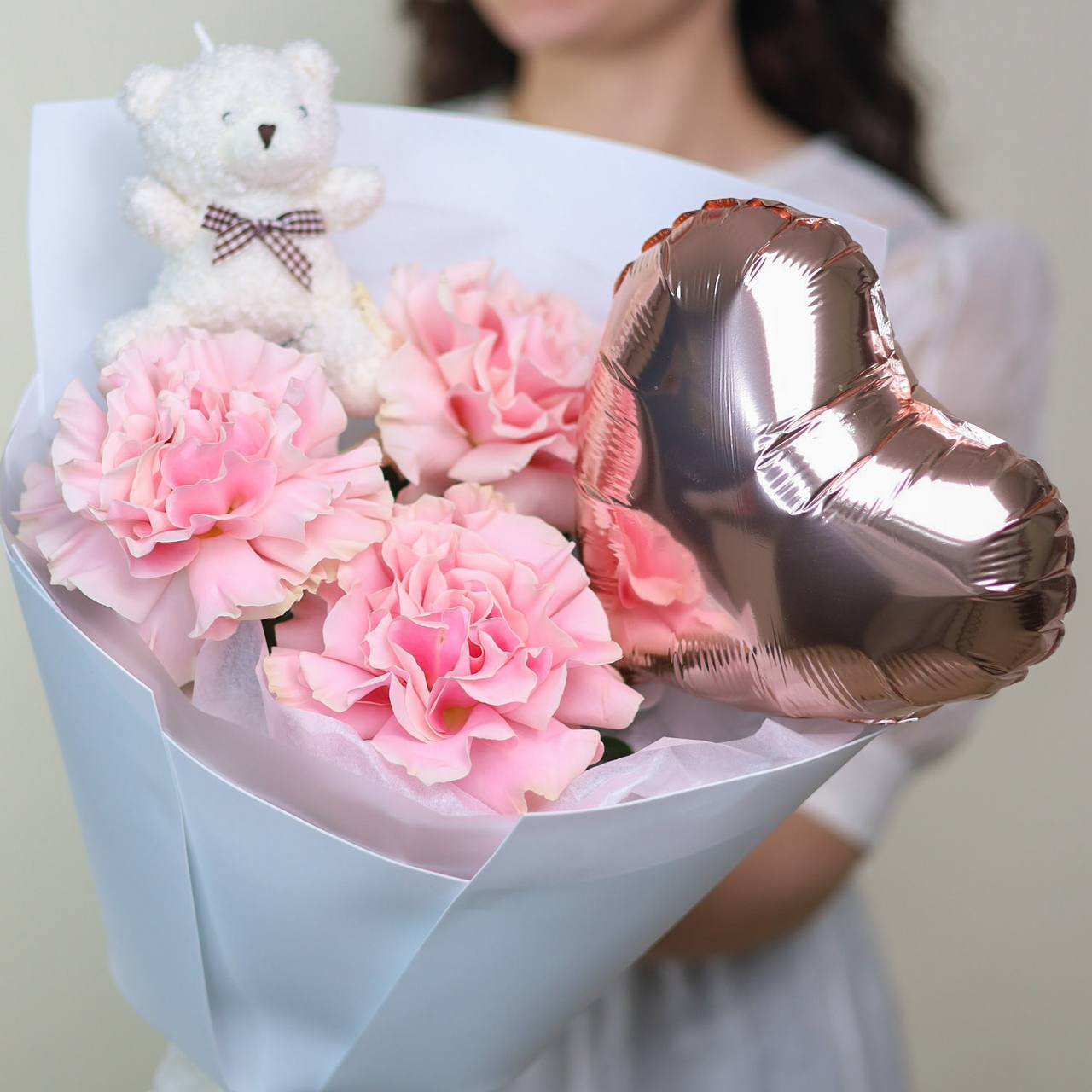 Букет французских роз, воздушного шара и мягкой игрушки в оформлении.