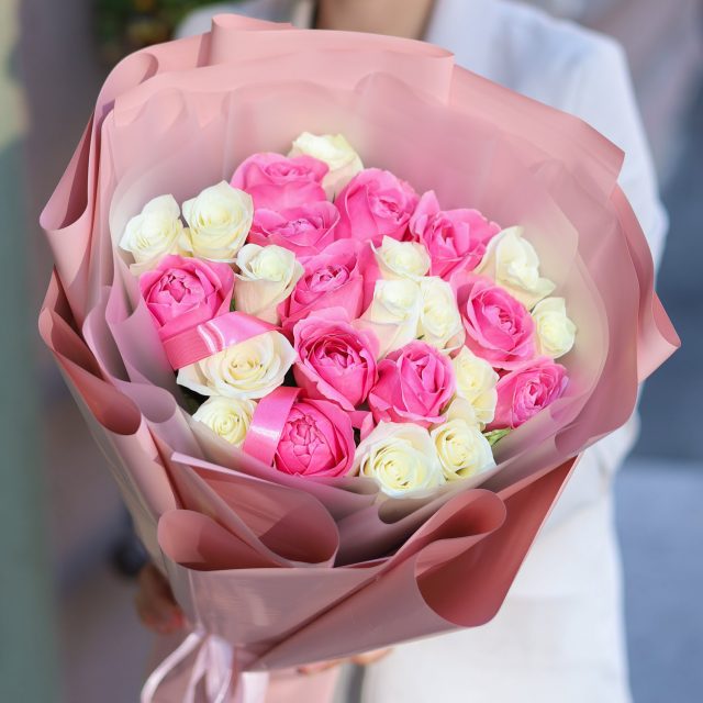 Очаровательный букет из 25-ти розовых и белых роз микс оформлении.