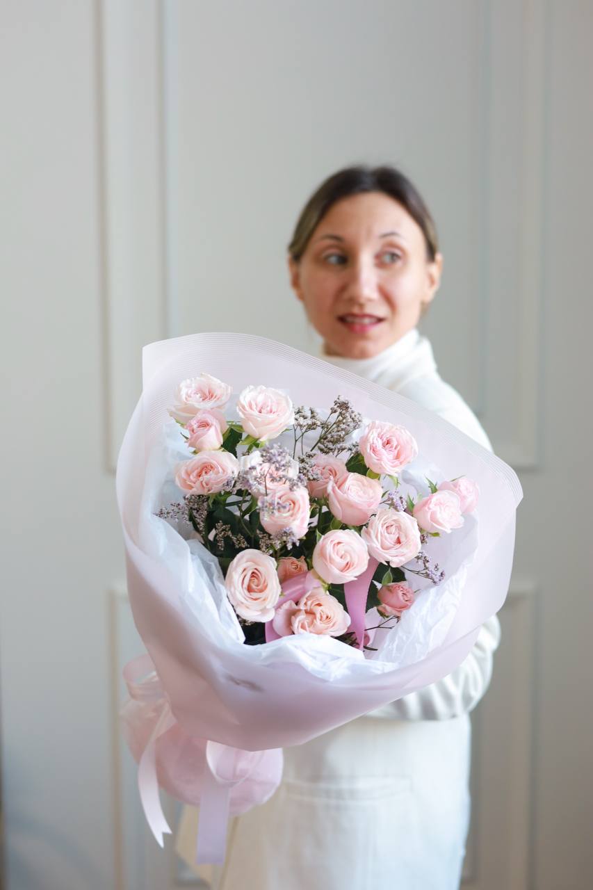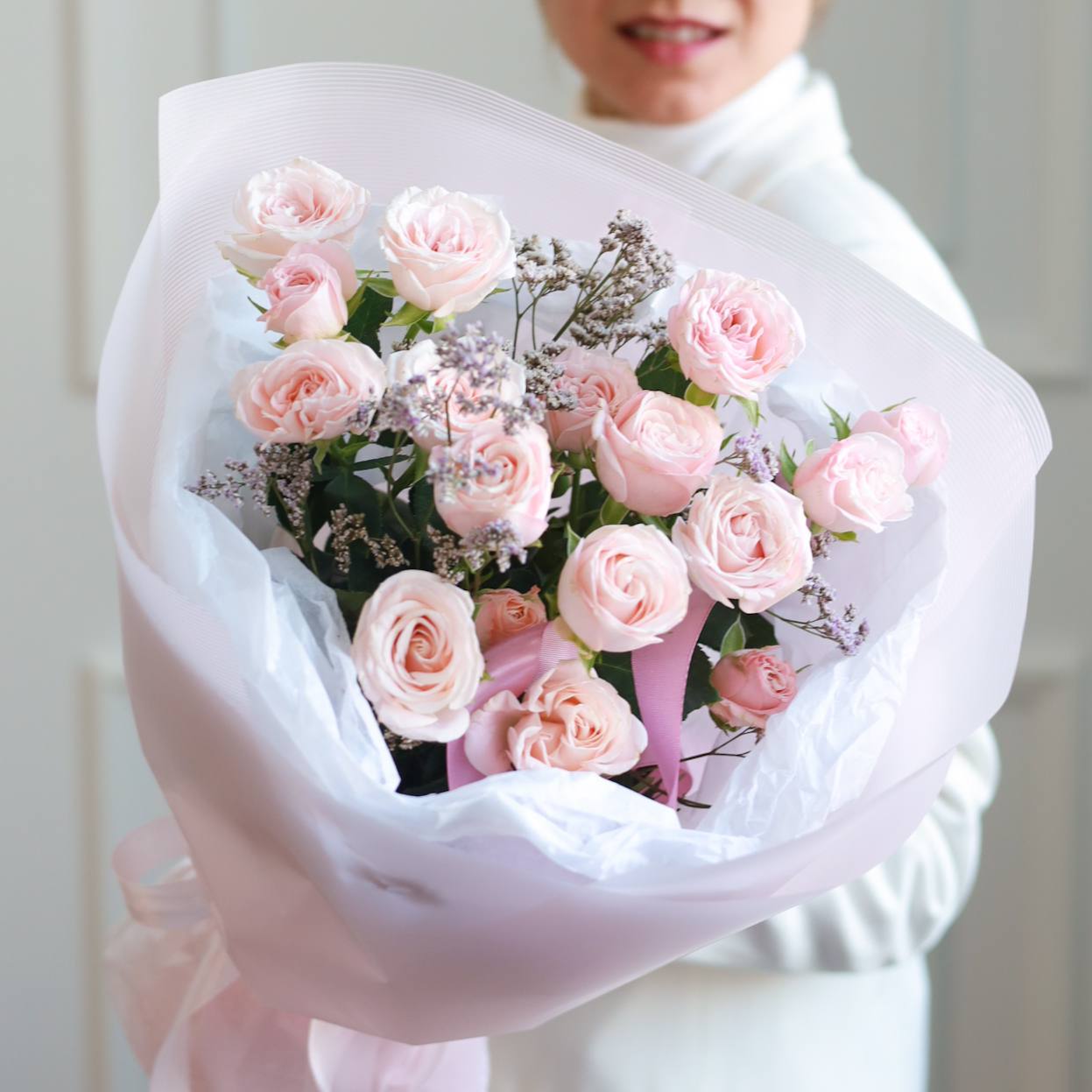 Красивый букет из 3-х веток кустовых пионовидных роз с лимониумом.