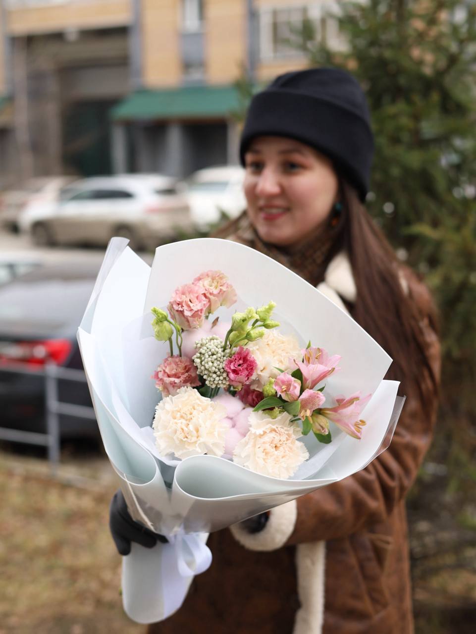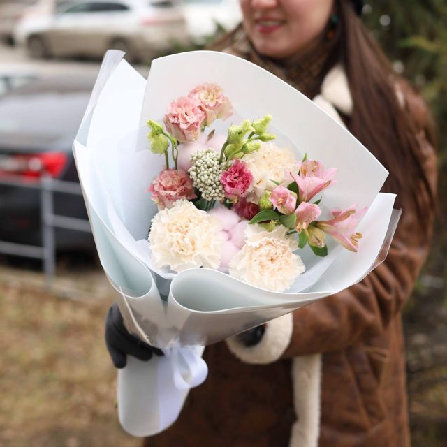Очаровательный букет с нежной эустомой, стойкими диантусами, альстромерией и хлопком.