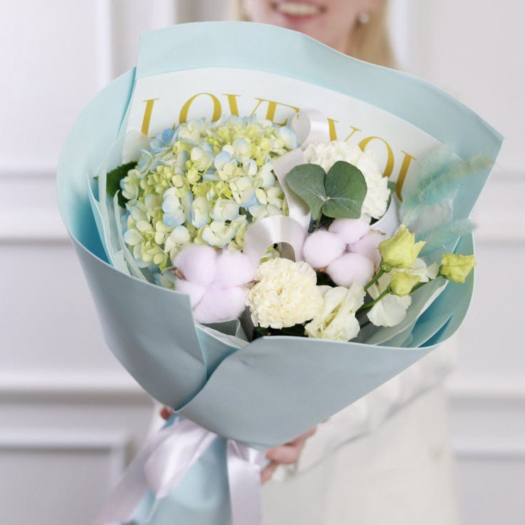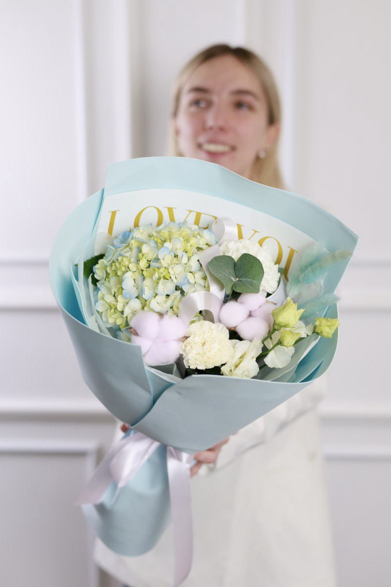 Очаровательный букет в воздушном оформлении в голубой гамме
