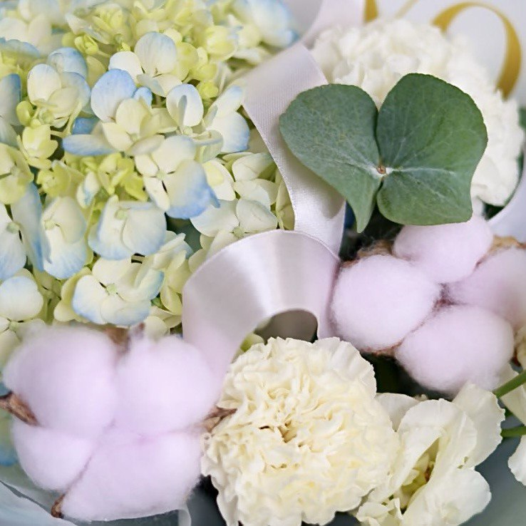 В букете: пышная гортензия, диантусы, эустома, а так же сухоцветы