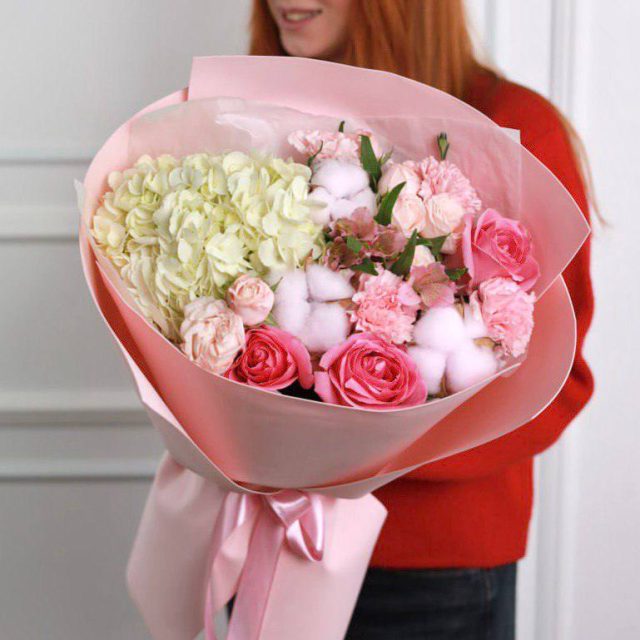 Состав: пышная гортензия, стойкие диантусы, розы, кустовые розы, альстромерия и хлопок