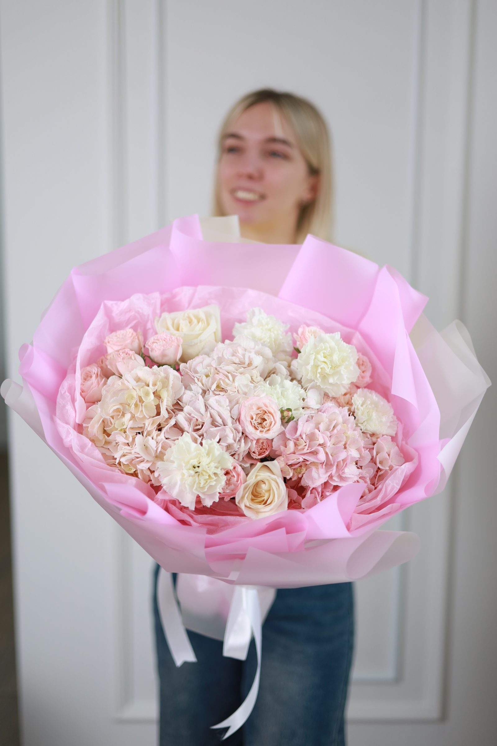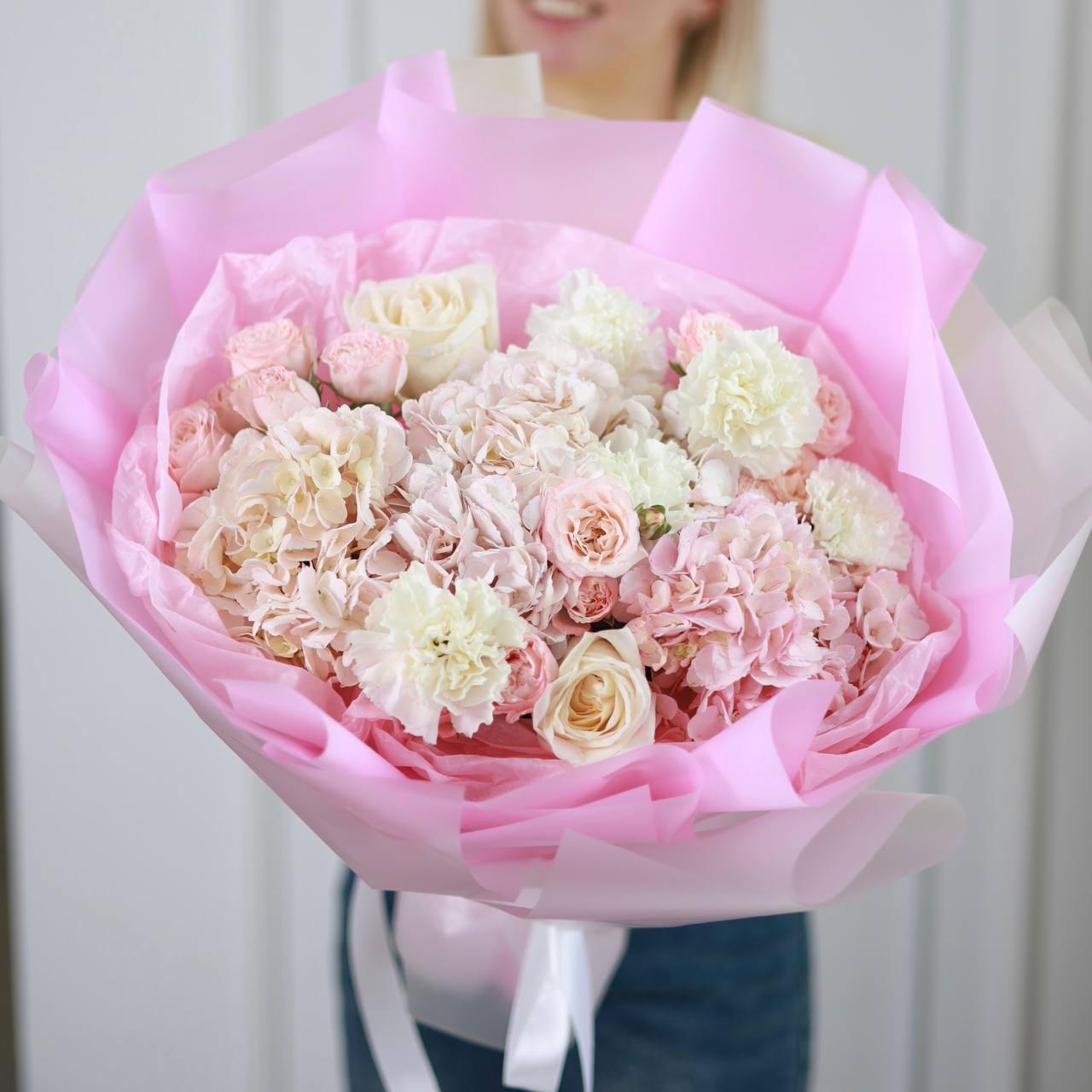 Букет с пышной гортензией, ароматными пионовидными одноголовыми розами, стойкими диантусами, кустовыми пионовидными розами в оформлении.