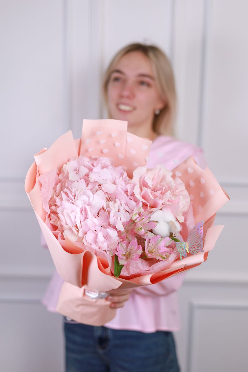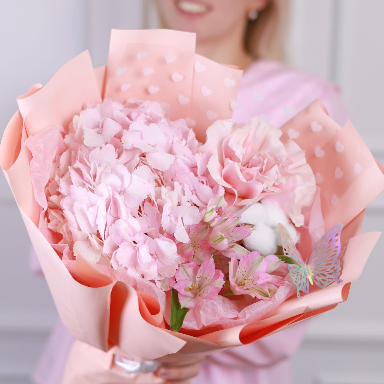 Красивый букет с пышной гортензией, французской розой, альстромерией и хлопком в оформлении.