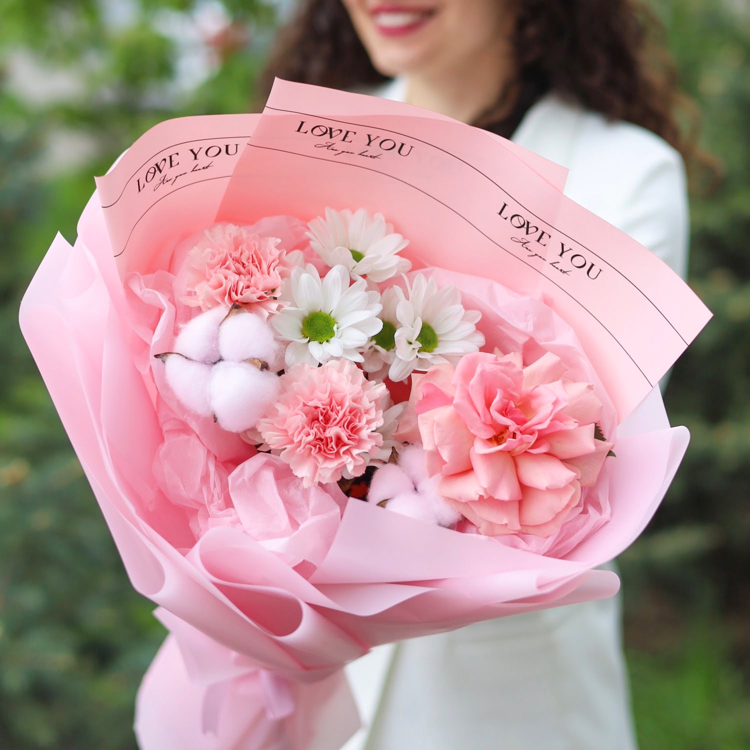 В букете: французская роза, стойкие диантусы, хризантема и хлопок.