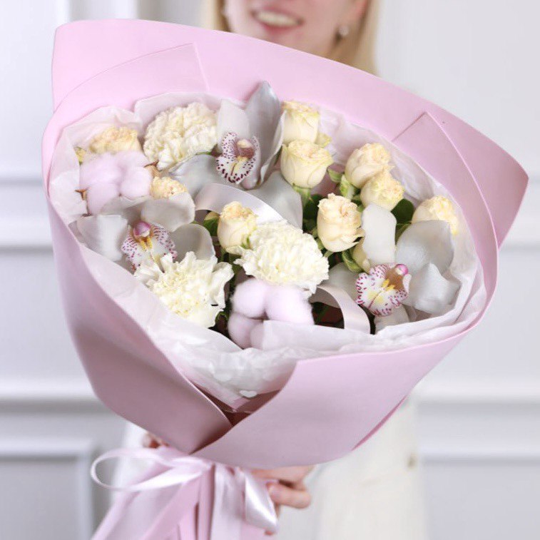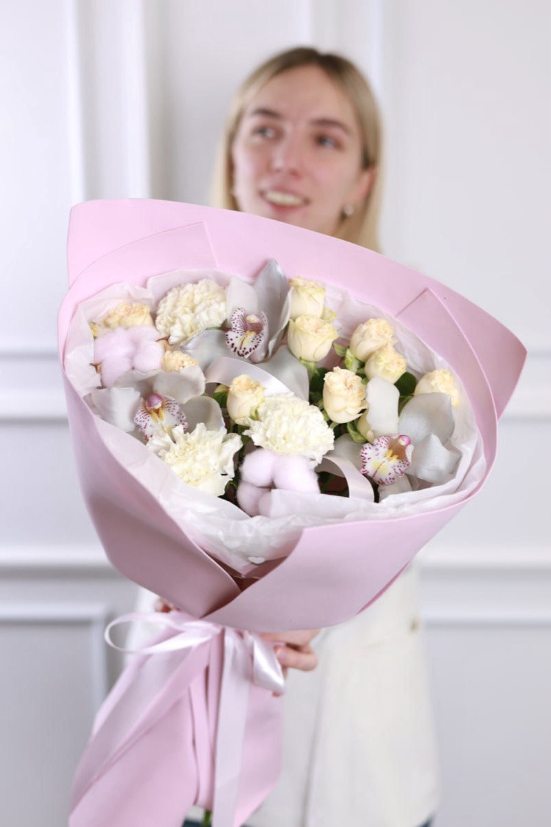 В составе букета: стойкие орхидеи, диантусы, хлопок и пионовидные кустовые розы