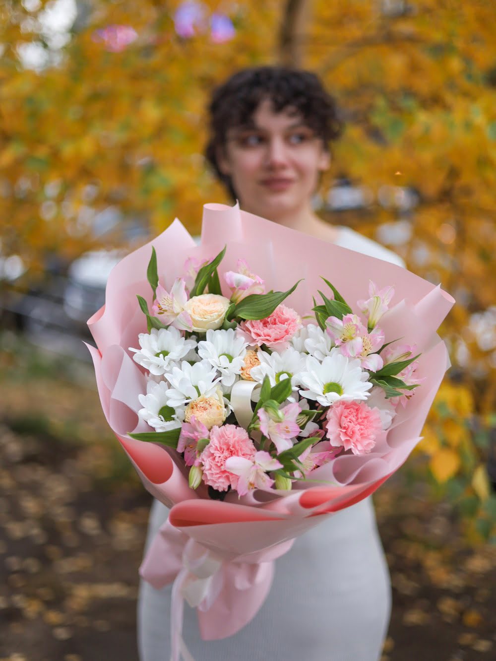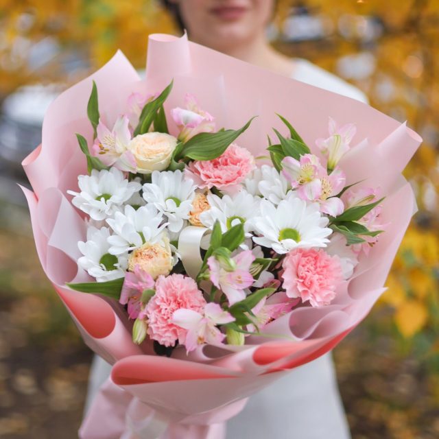 Состав: кустовые пионовидные розы, стойкие диантусы, альстромерия и хризантема.