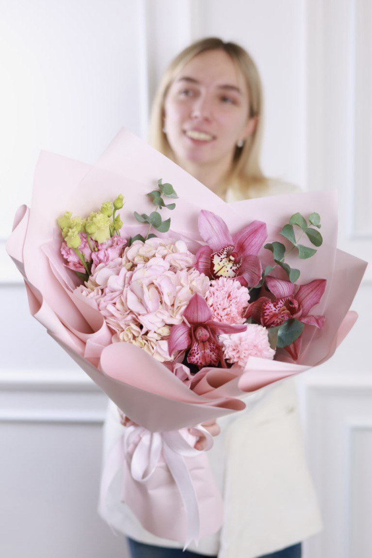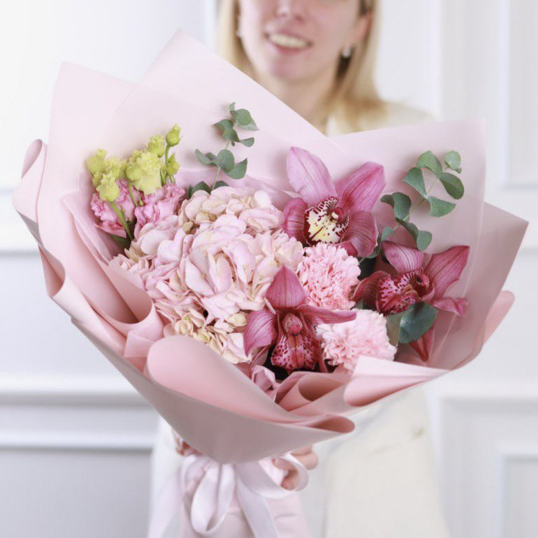 Букет в розовой гамме, с гортензией, эустомой, диантусами, орхидеями и эвкалиптом