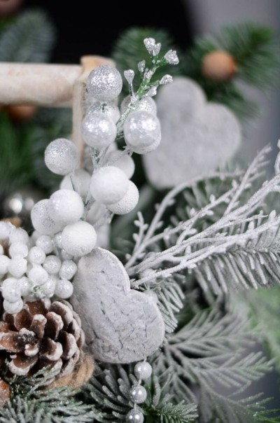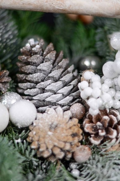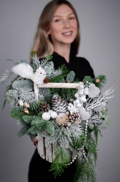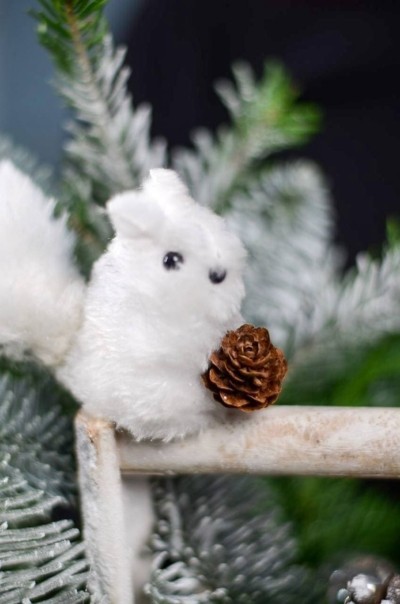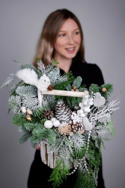 Очаровательная композиция с нобилисом, туей, шишками, зимним декором и белочкой в деревянном кашпо.