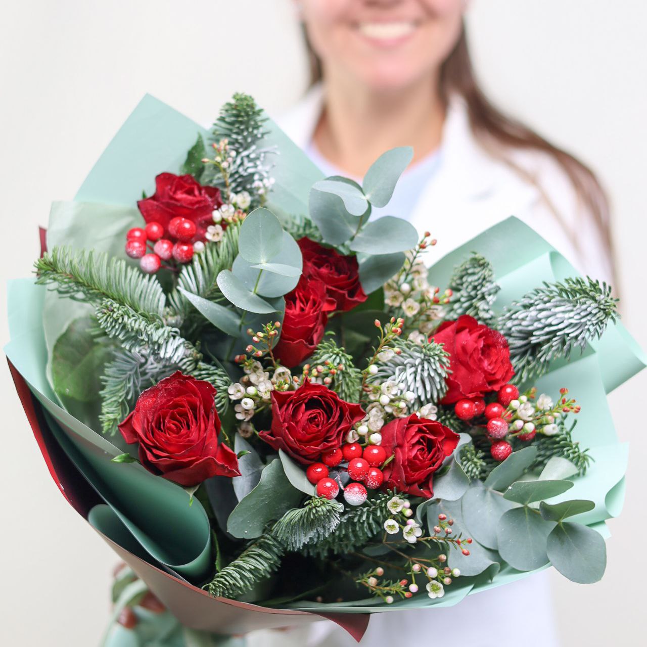 Букет роз, датской ели, хамелациума и душистого эвкалипта в оформлении.