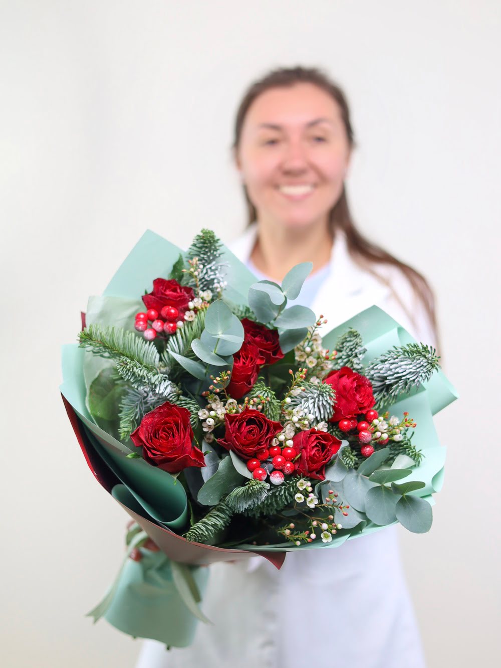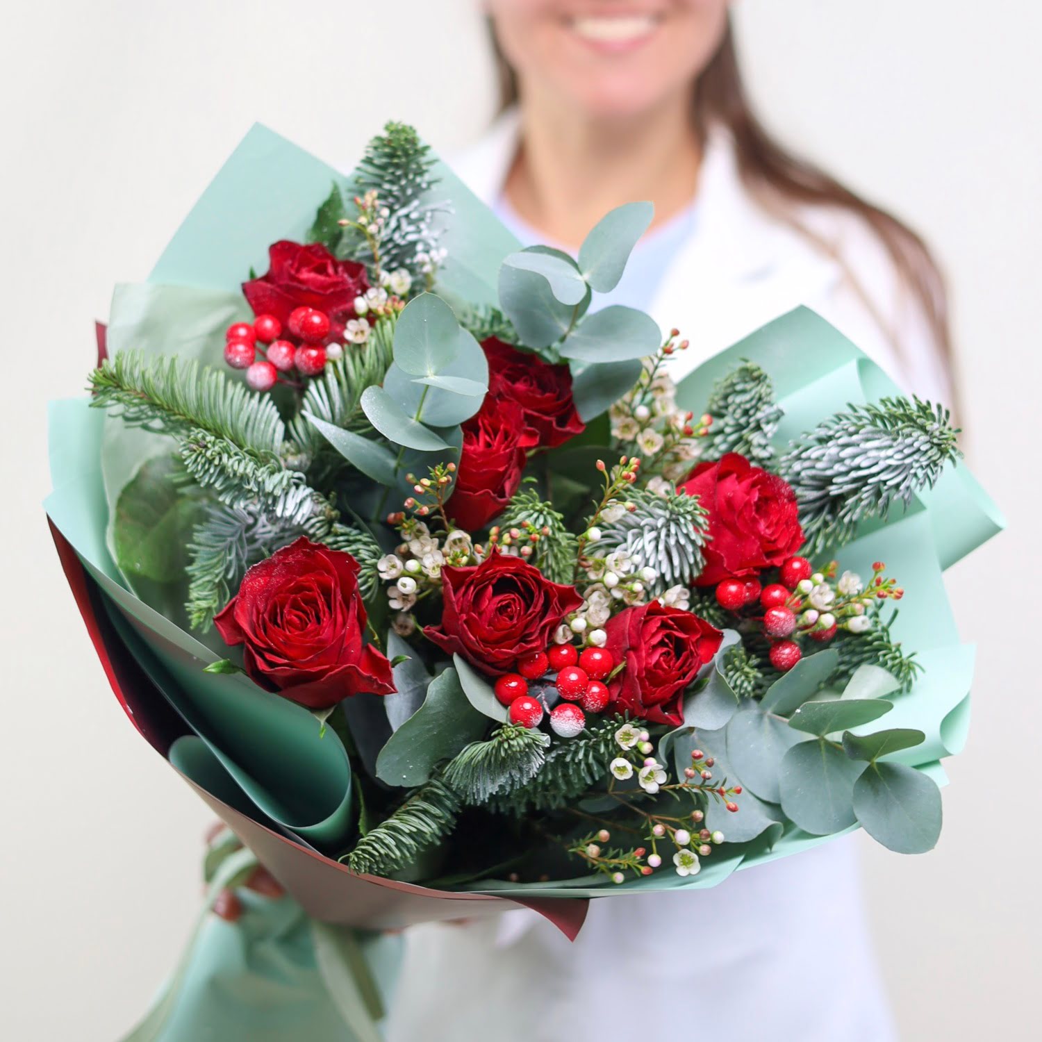 Состав: одноголовые розы, натуральная ель нобилис, декор, хамелациум, эвкалипт.