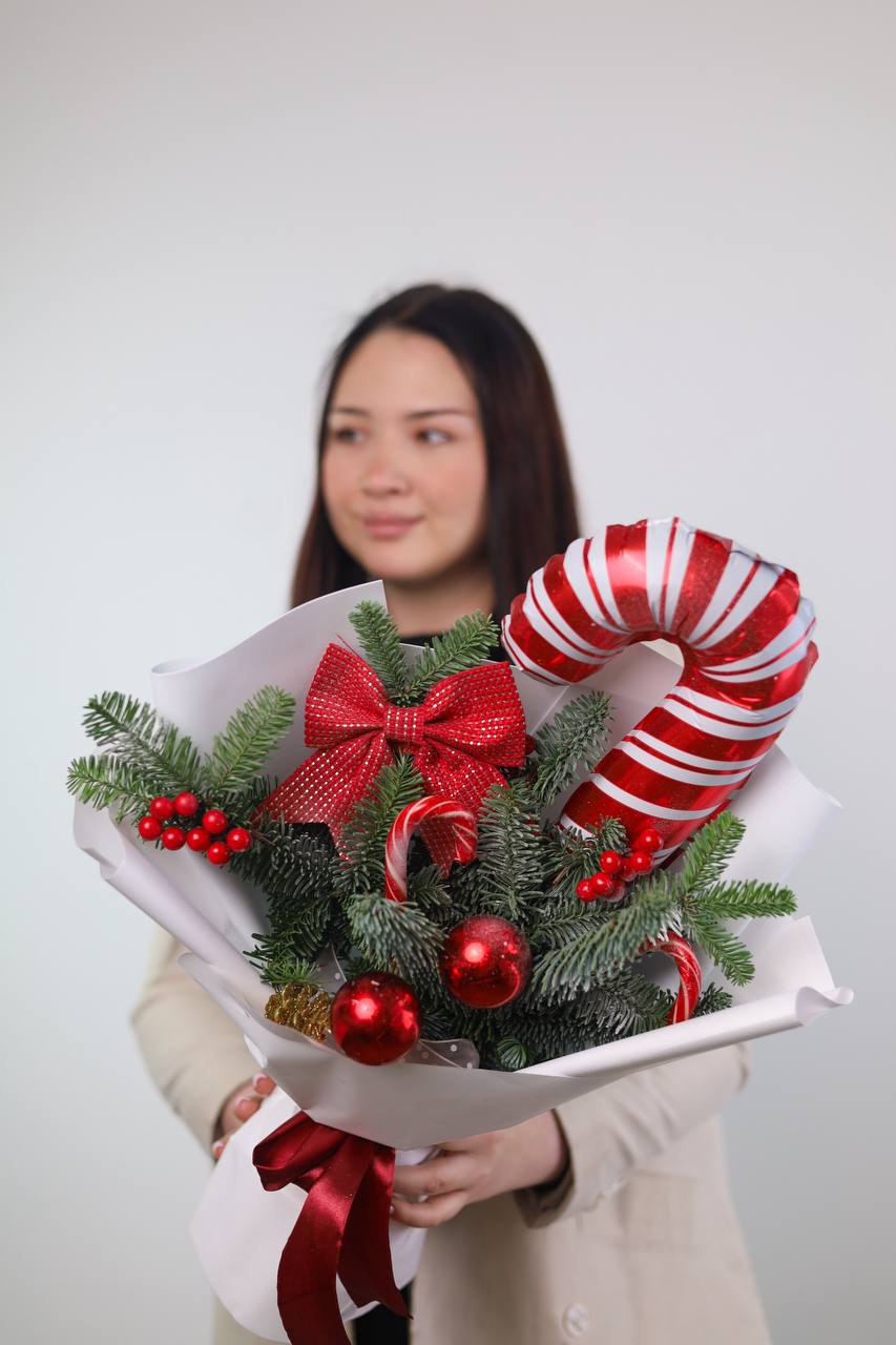 Букет нобилиса, игрушек и воздушного шара в оформлении.