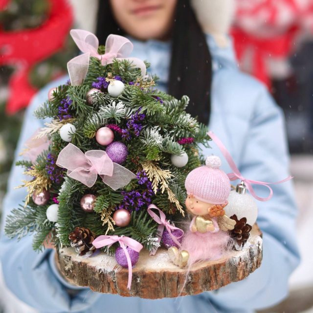 Состав: ель нобилис, елочные игрушки, шишки, куколка.