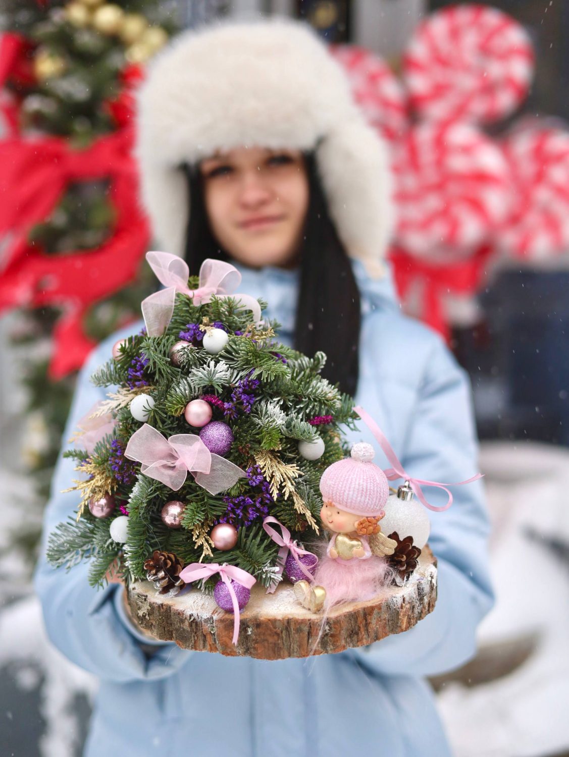 Очаровательная зимняя композиция в сиреневой гамме с декором. Выполнена на спиле.
