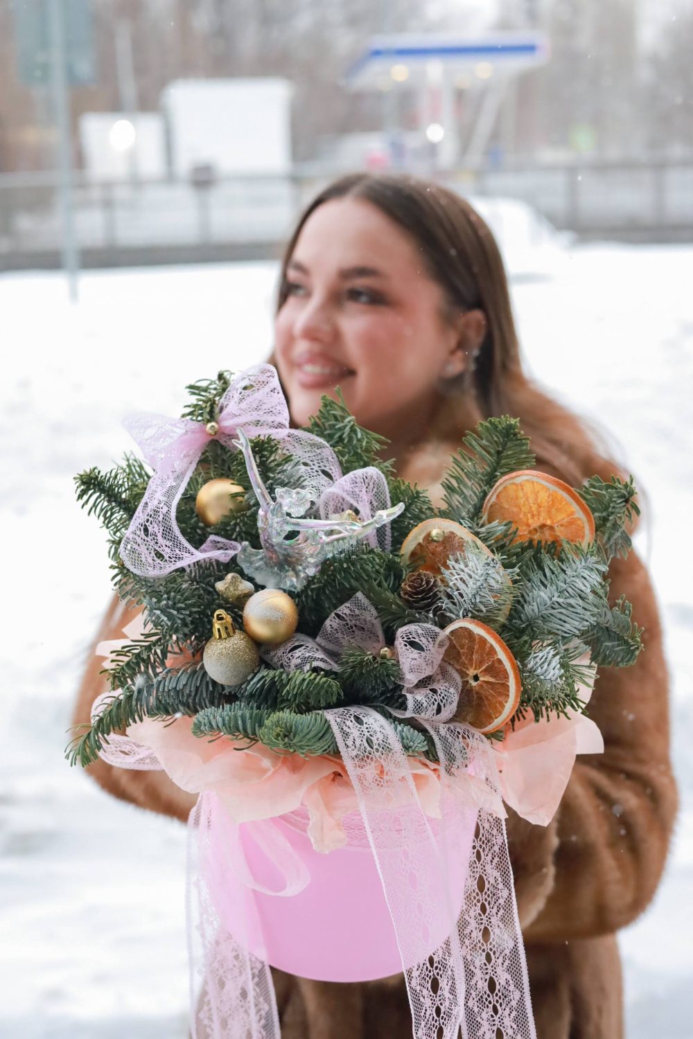 Красивая зимняя композиция в розовой гамме в шляпной коробке.