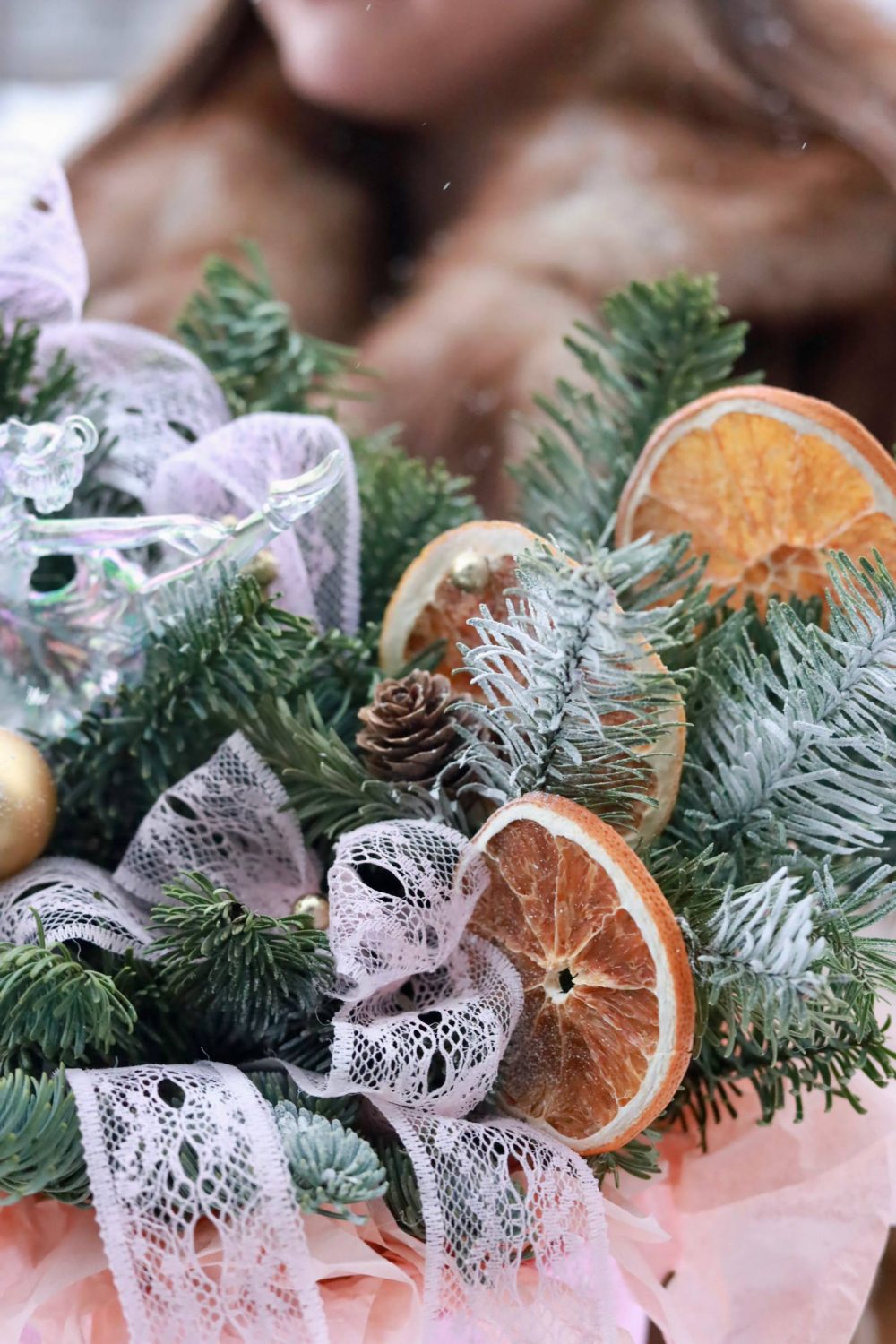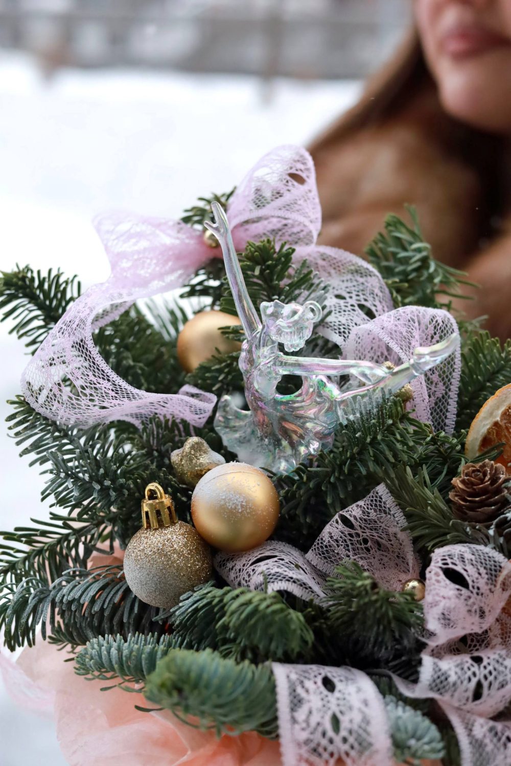 Состав: ель нобилис, апельсины, шишки, елочные игрушки, фигурка балерины.
