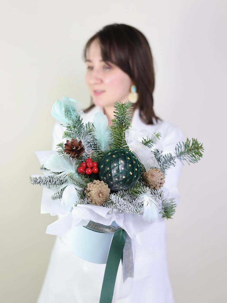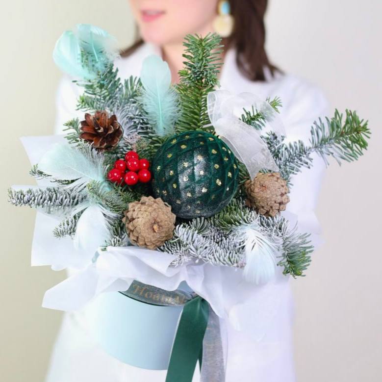 Очаровательная композиция в зелёной гамме с елью нобилис, игрушками и шишками.