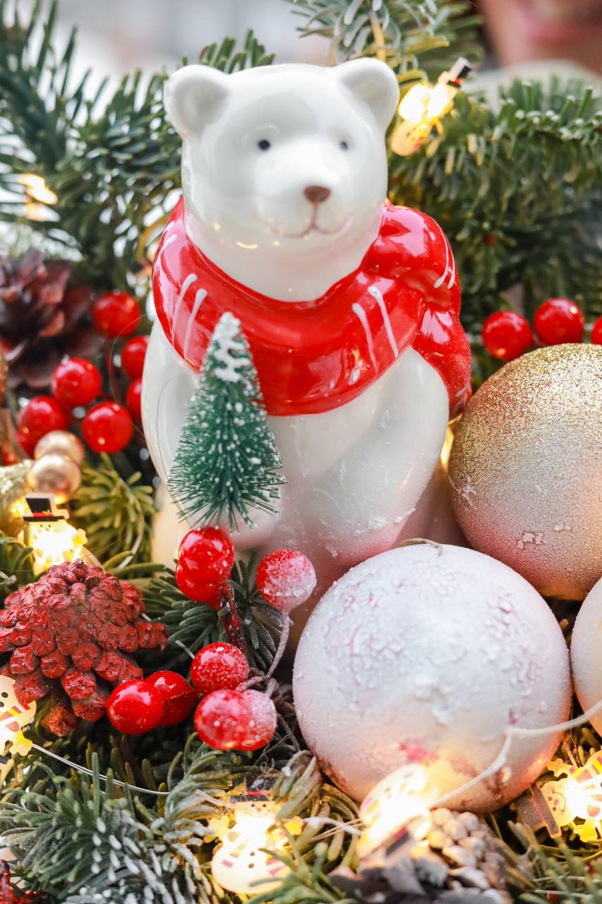 Состав: живая ель Нобилис, шишки, гирлянда в виде снеговичков, ёлочные игрушки, декор, фигурка в виде полярного медведя, леденец.