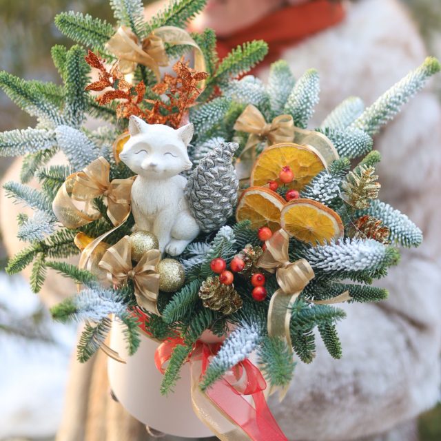 Состав: новогодний декор, сухоцветы, апельсины, натуральная датская ель нобилис, фигурка лисички. Высота около 30-35 см.