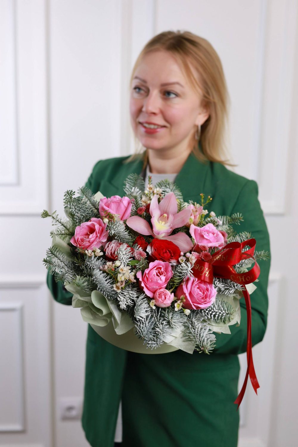 Красивая и очень стойкая композиция с орхидеей, розами, нобилисом и хамелациумом.