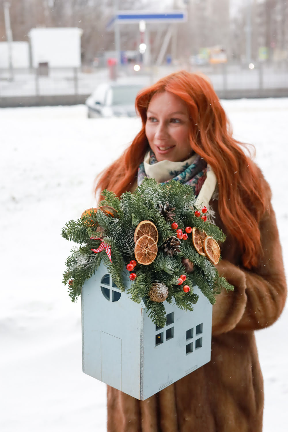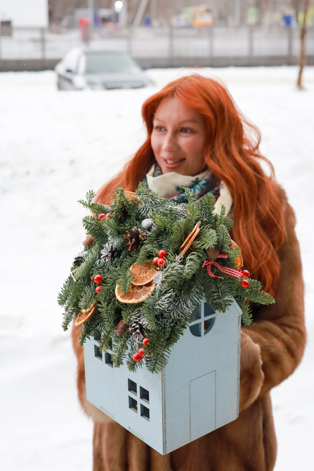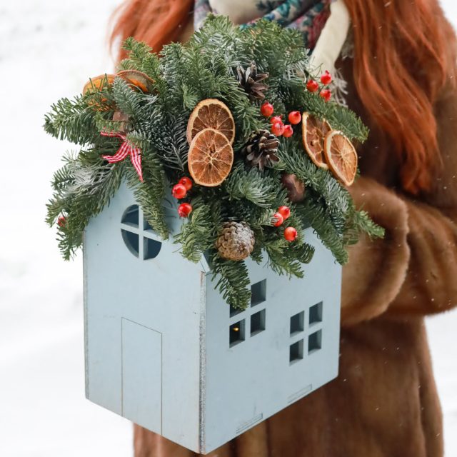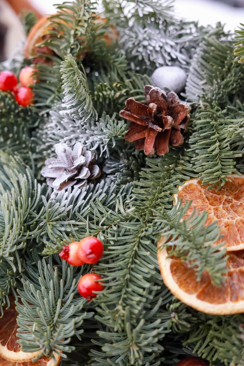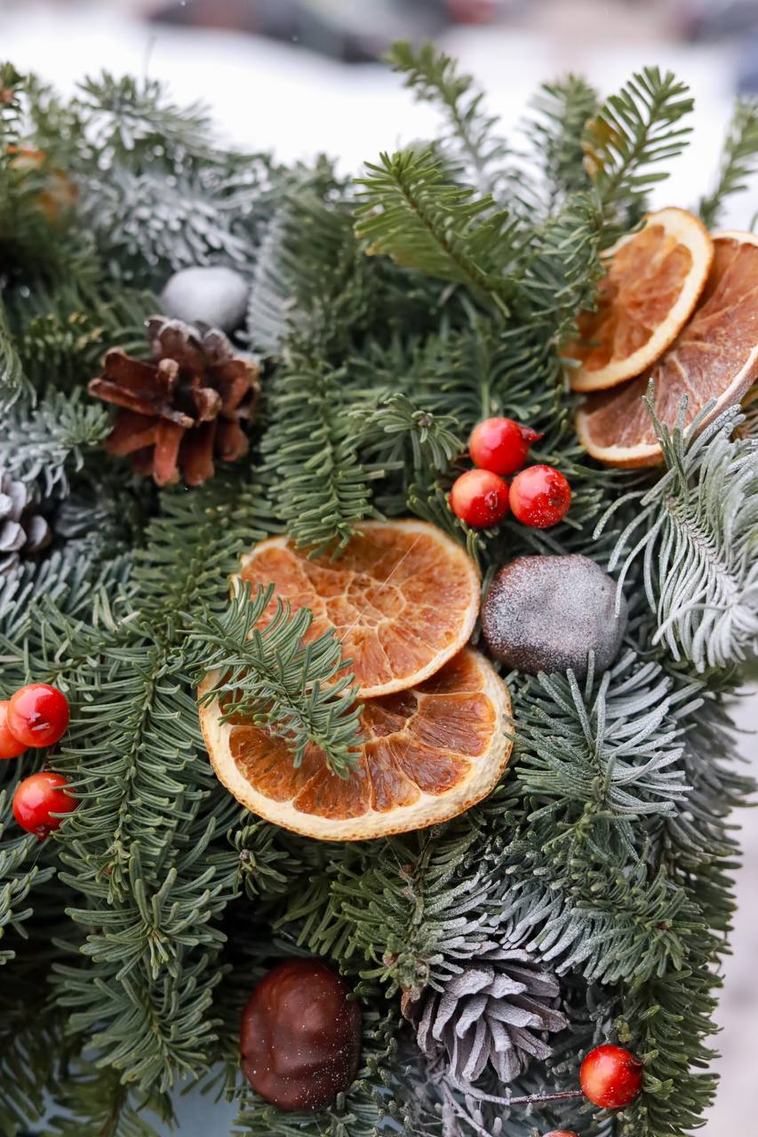 Состав: натуральный нобилис, апельсины, шишки, декор.