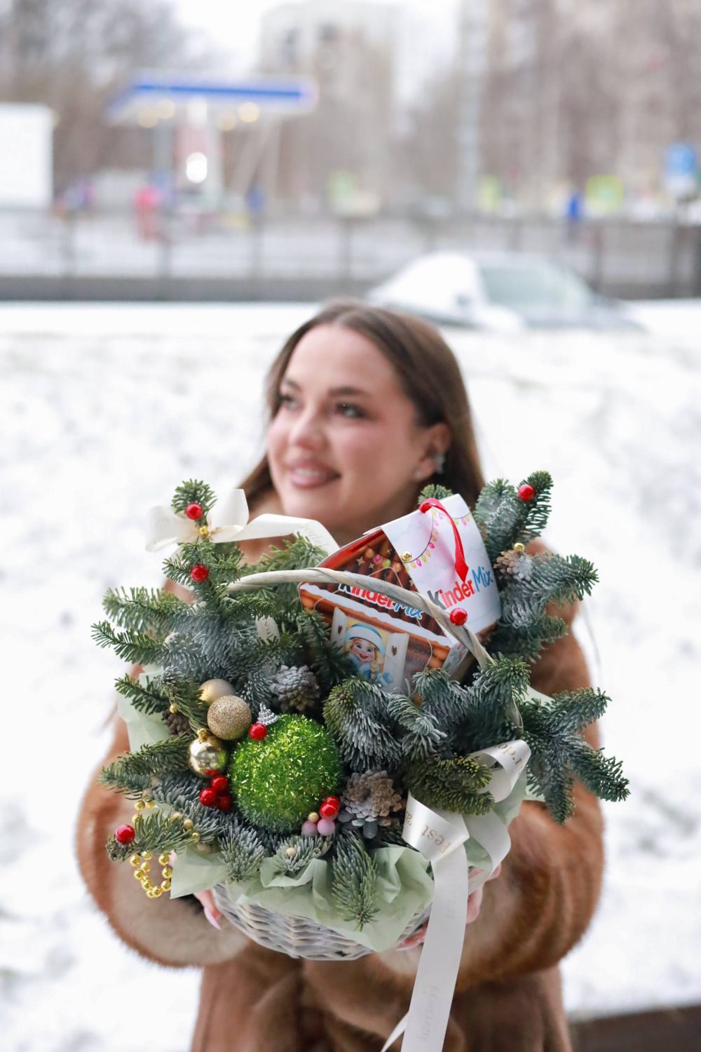 Прекрасная сборная композиция с ароматной елью и конфетами – идеальный подарок на Новый год.