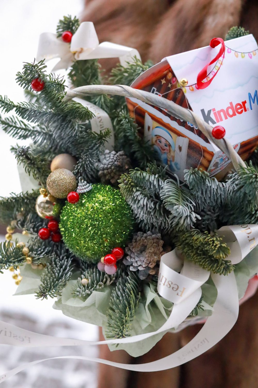 Состав: ель нобилис, шишки, игрушки елочные, бусы, подарок Kinder Mix.