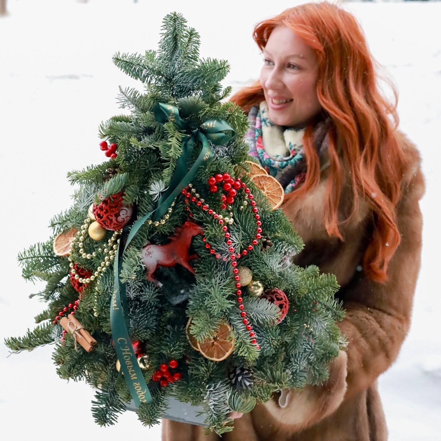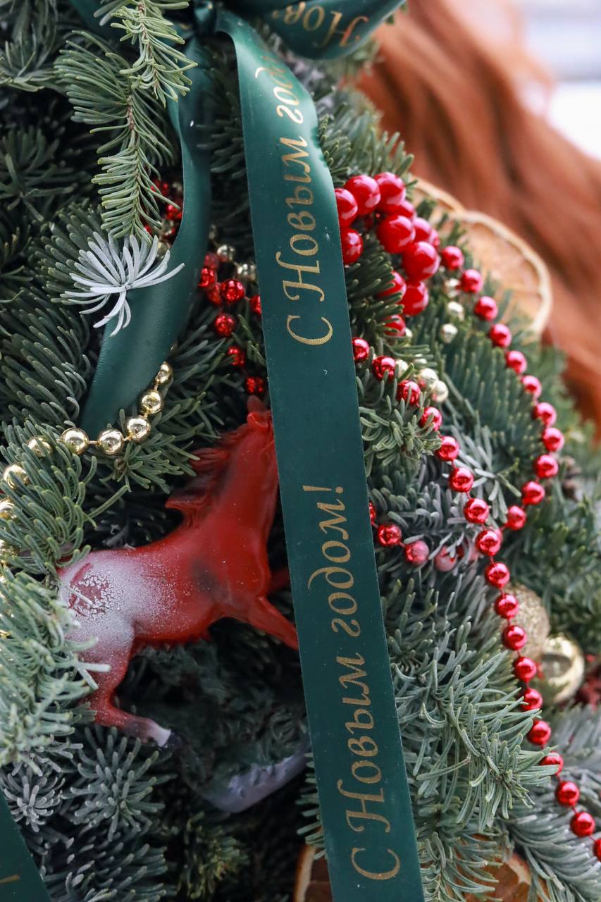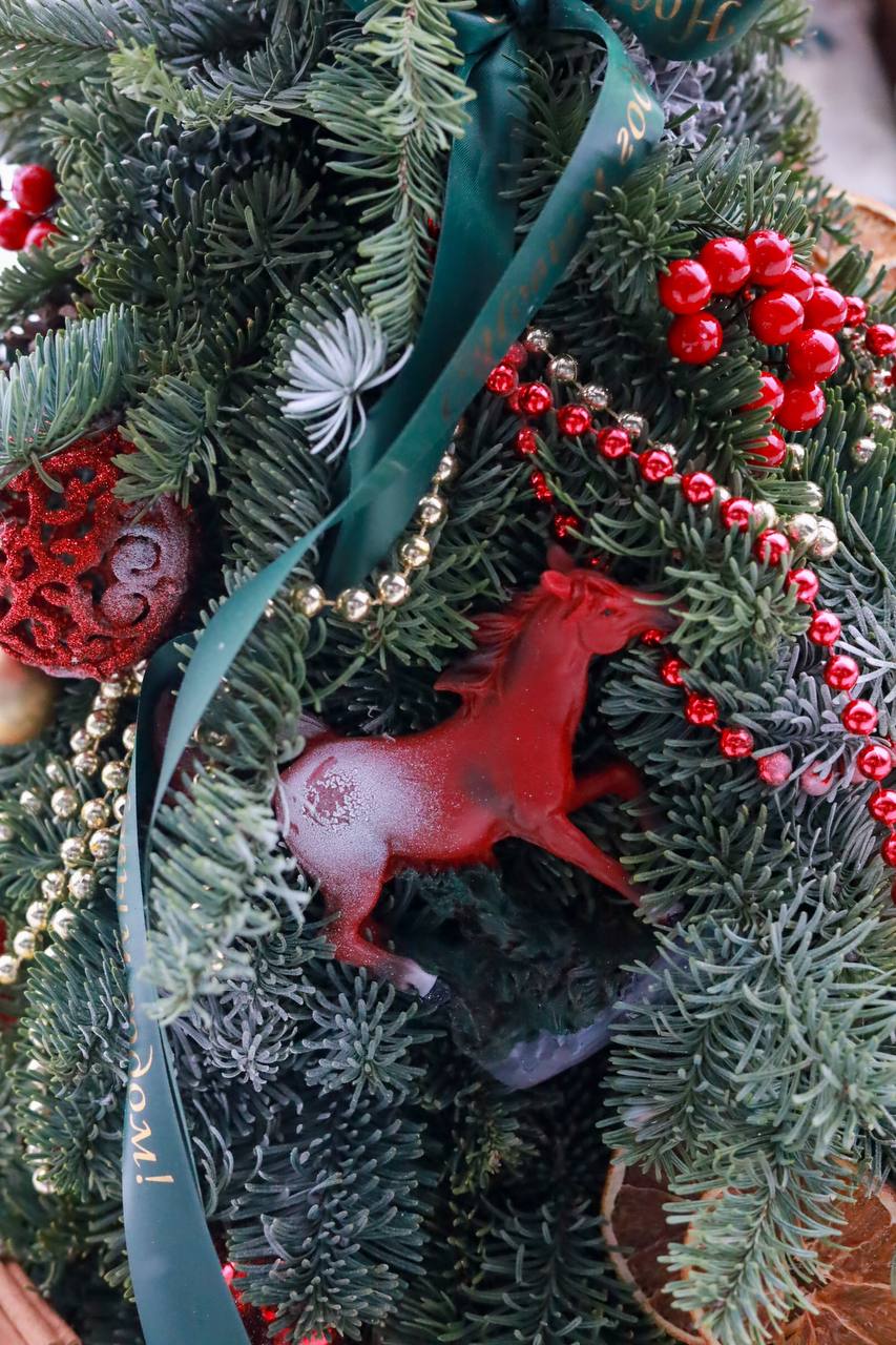 Состав: ароматная датская ель Нобилис, ёлочные игрушки, апельсины, корица, бусы, фигурка символа года Огненная Лошадь.