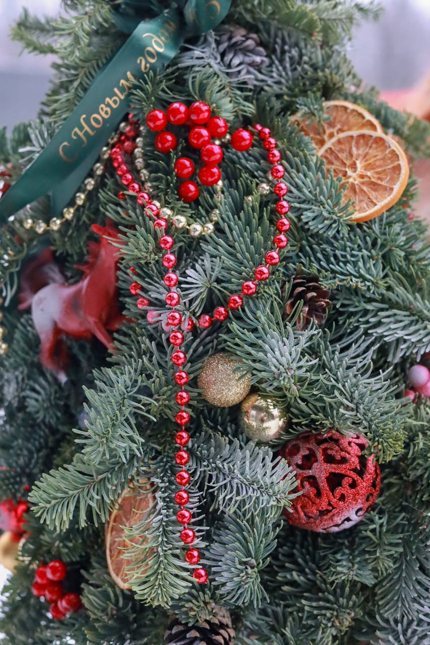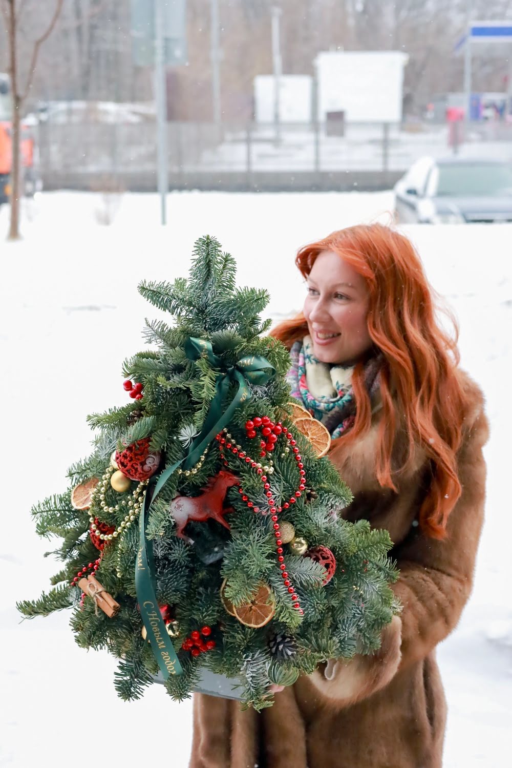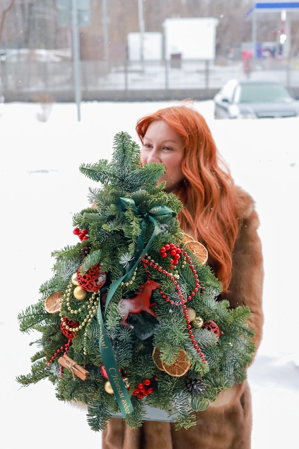 Состав: ароматная датская ель Нобилис, ёлочные игрушки, апельсины, корица, бусы, фигурка символа года Огненная Лошадь.