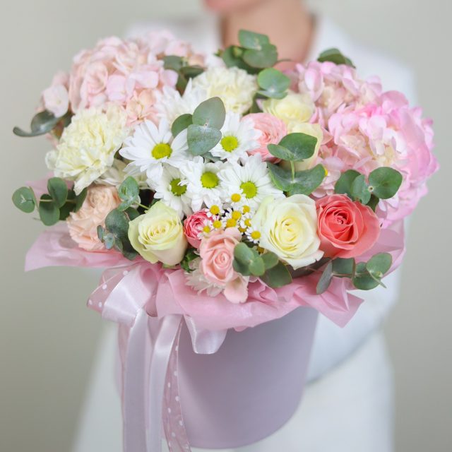 Очаровательная композиция в нежной гамме в шляпной коробке.
